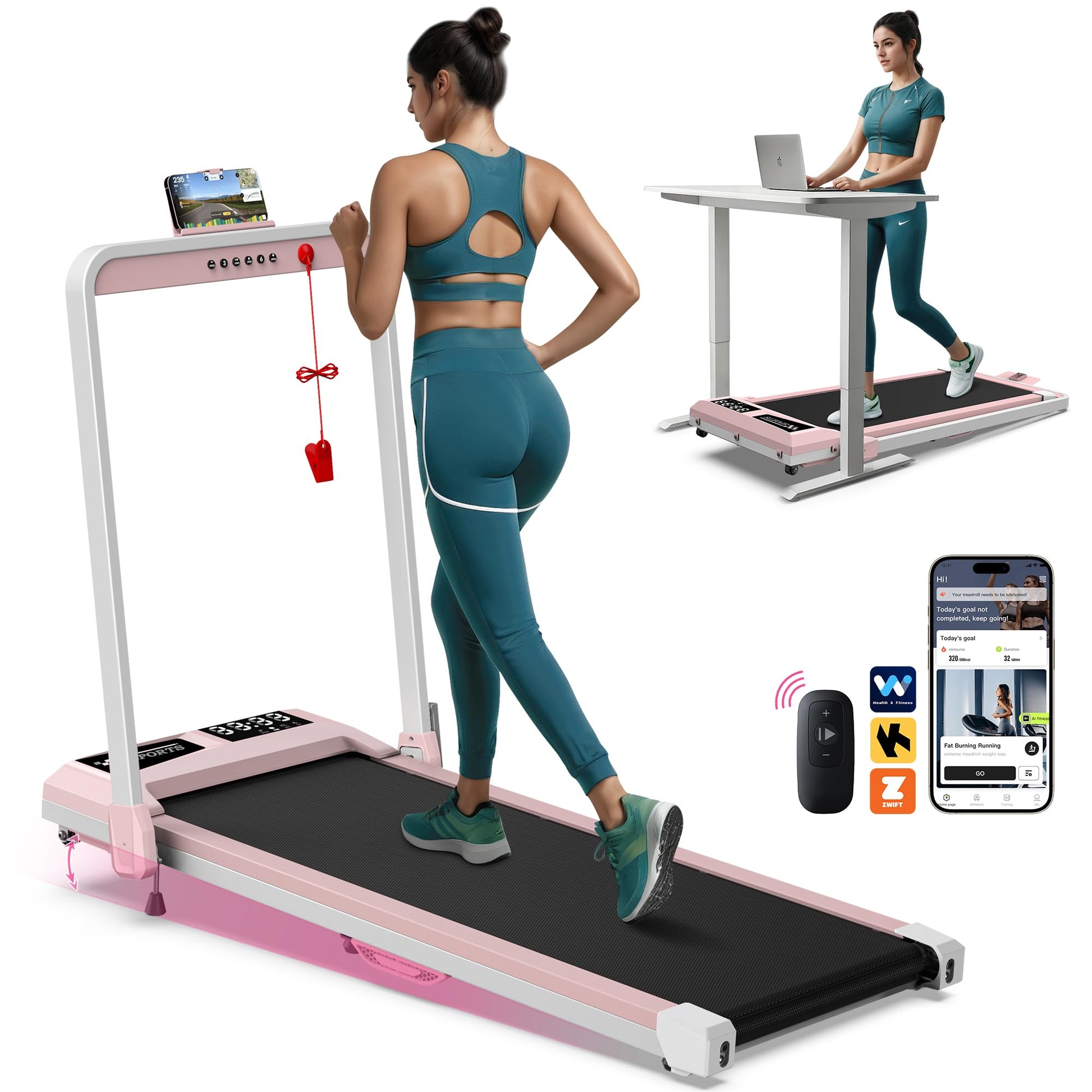 - 2 in 1 Foldable Treadmill: The folding treadmill can meet different workout needs. With the handle down, you could enjoy walking or jogging at speeds of 0.6-3.8 mph. When raising the handle, you could enjoy running at speeds of 0.6-7.6 mph to achieve higher fitness goals. The handle and safety key ensure added security during high-intensity exercise. Plus, you can put the phone in the phone holder and enjoy the movie or have a conference call while exercising.