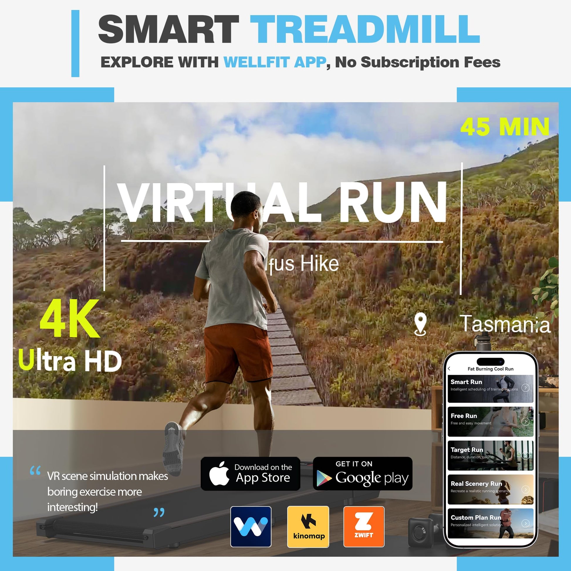 - Smart App Connection -- Portable treadmill is equipped with KINOMAP/Z/WELLFIT APP function, and provide smart AI voice assistant to start your personalized exercise for you. and enjoying the joy of fitness anytime, anywhere, without subscription fees!