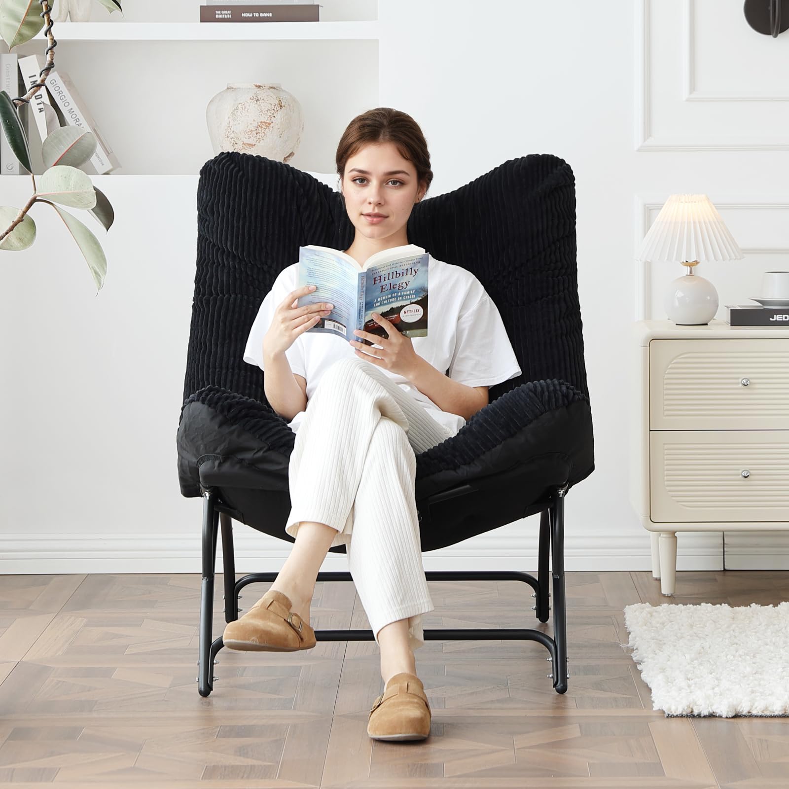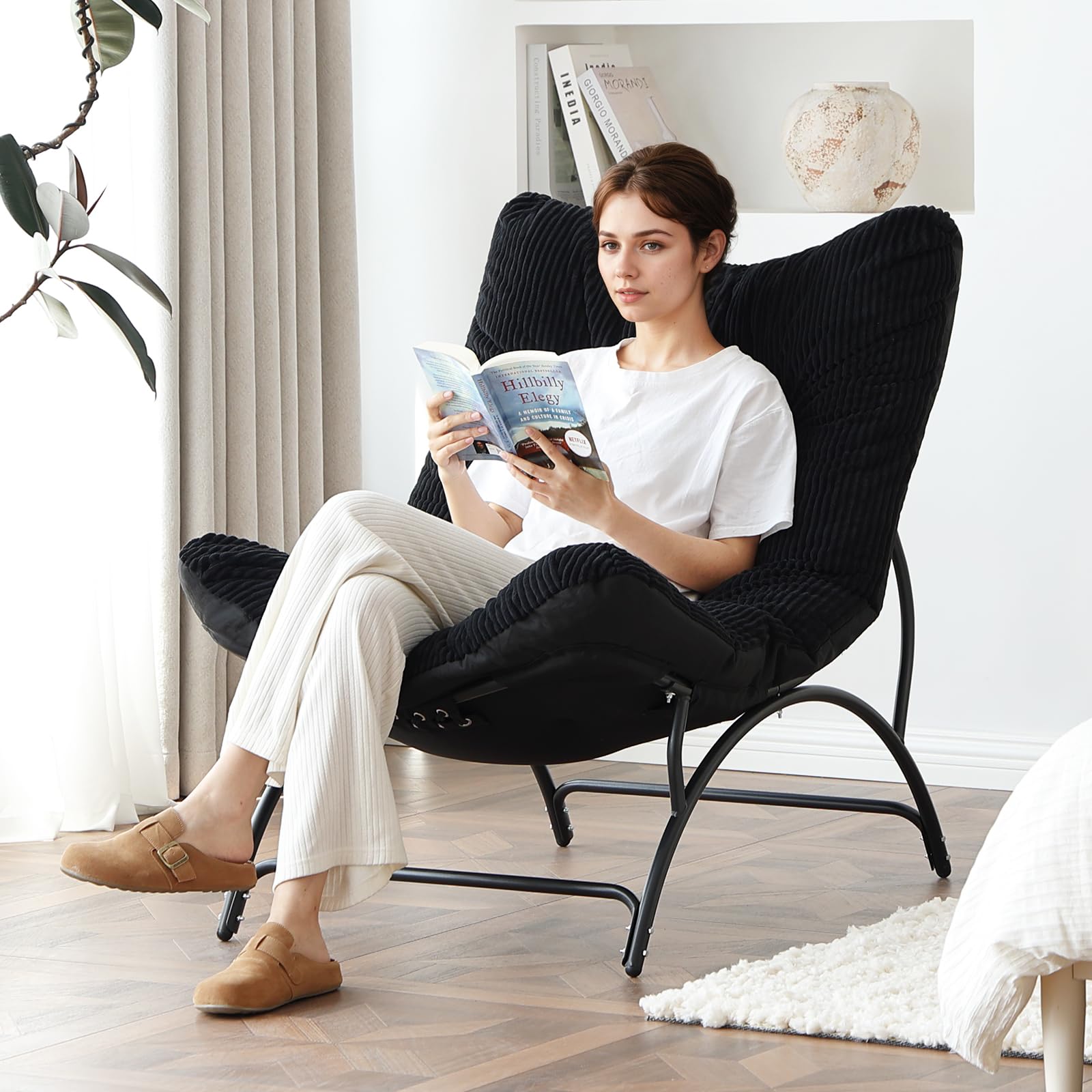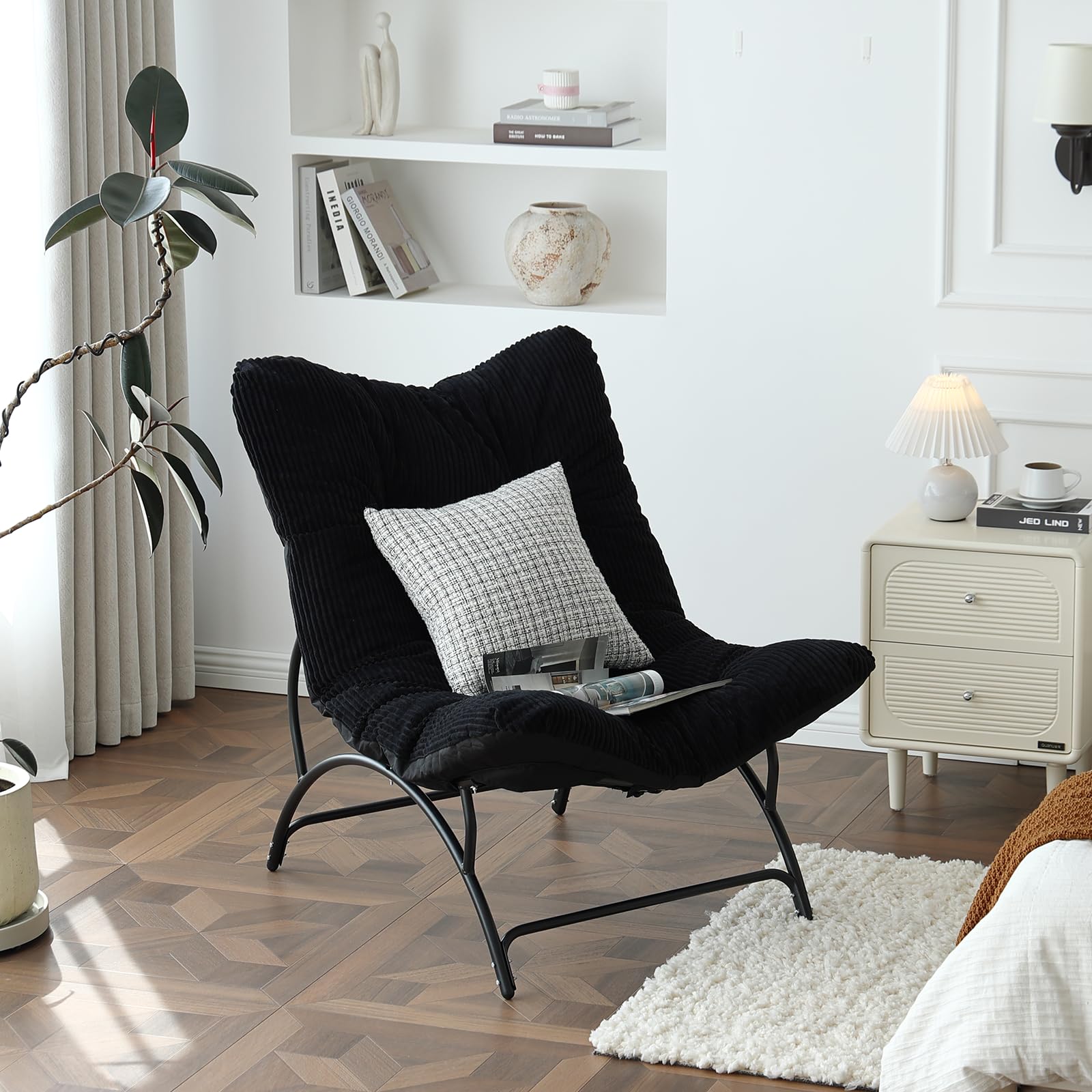 Welnow Accent Lounge Lazy Chair, Comfy Soft Leisure Metal Frame Reading Chair, Upholstered Thick Cushion Seated Recliner Sofa for Living Room, Bedroom, Dorm, Black