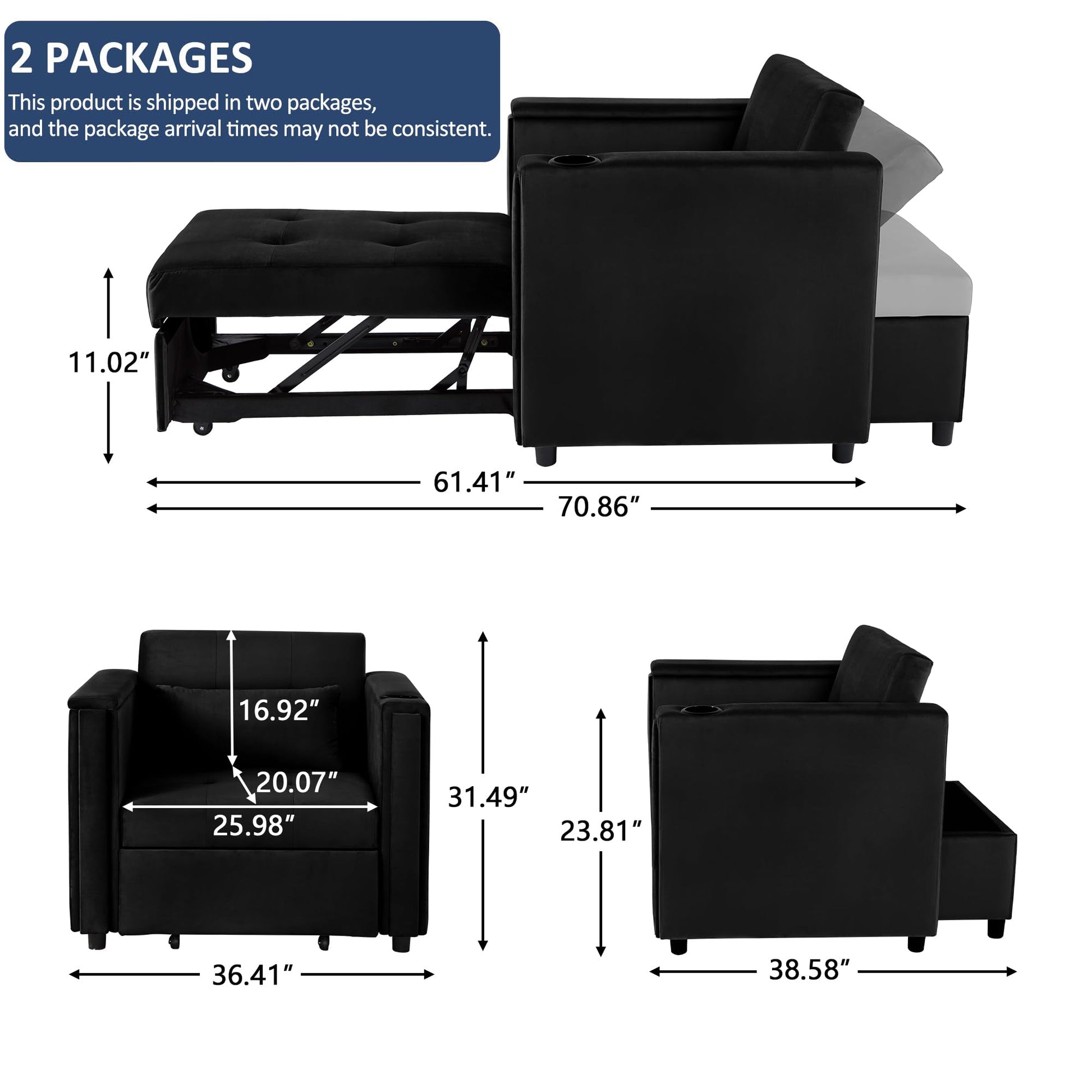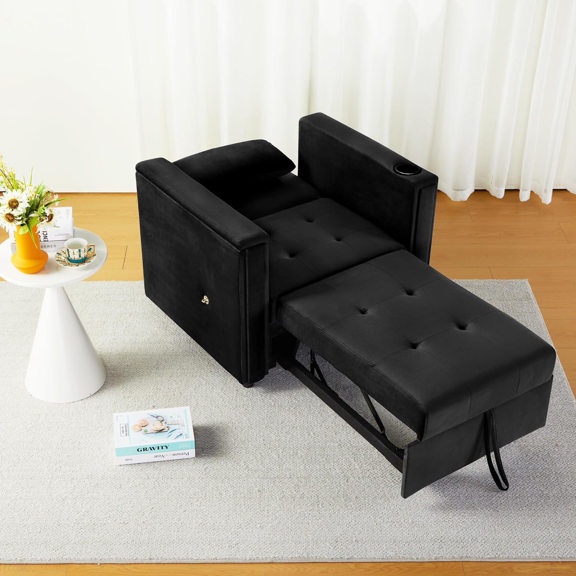 weselon Velvet Convertible Chair Bed, 3 in 1 Multi-Functional Lounge Chair Sleeper, Pull Out Couch Guest Bed with Hidden Table and Adjustable Backrest for Living Room Small Space Apartment (Black)