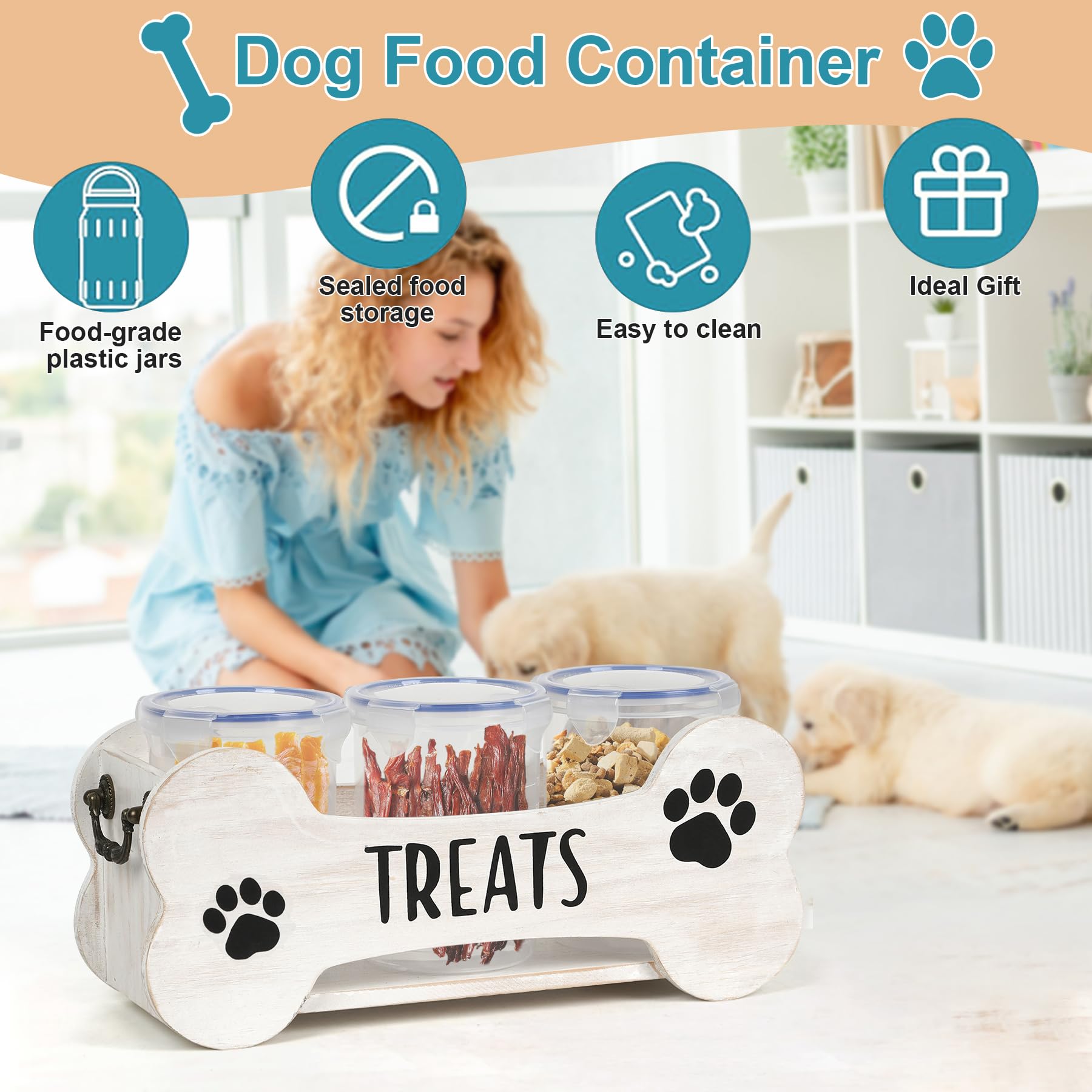 WGFKVAS Dog Treat Container Dog Food Storage Container for Countertop,Wooden Cat Food Storage Container with 3 Jars,Dog Treat Jar with Lid,Great Gift for Pet Dog Owners (White)