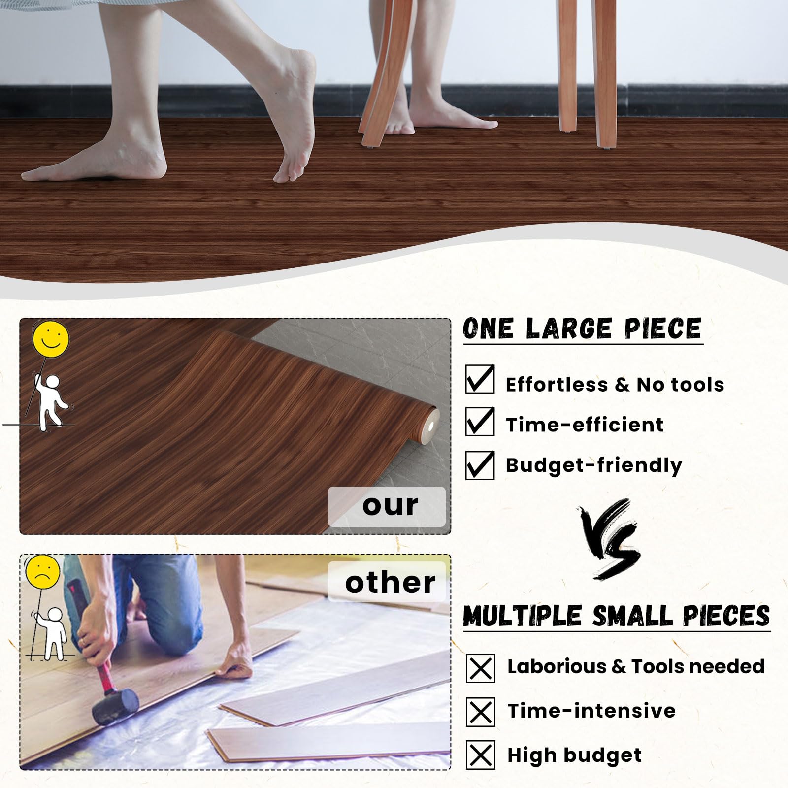 - 【Vinyl Flooring Roll】Our vinyl flooring is conveniently rolled up, providing significant advantages compared to traditional tile and strip floor stickers. It reduces material usage, seam requirements, and installation time, making it easier to handle, transport, and store.