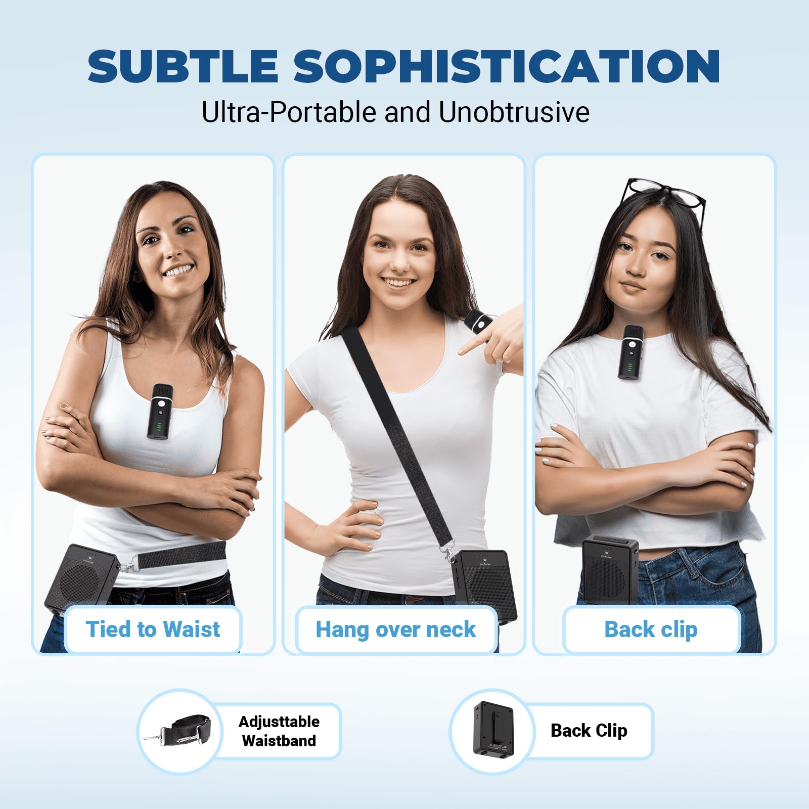 - 1.Professional-Grade Voice Amplifier with Lavalier Mic: Experience crystal-clear voice reproduction with our advanced clip-on microphone system. The high-sensitivity mic captures true vocal tones while our anti-feedback technology completely eliminates distortion and screeching. Enjoy studio-quality audio projection that keeps voices natural and clear, whether you're teaching, presenting, or addressing large groups