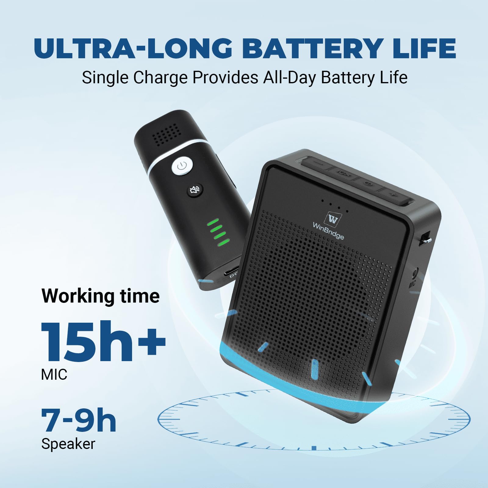 - 4.All-Day Battery Performance & Ultra-Light Design: The rechargeable microphone and speaker set delivers marathon performance: 15+ hours for the amplifier and 7-9 hours for the microphone. our ergonomic design features a discreet clip-on portable microphone that stays comfortable for extended wear