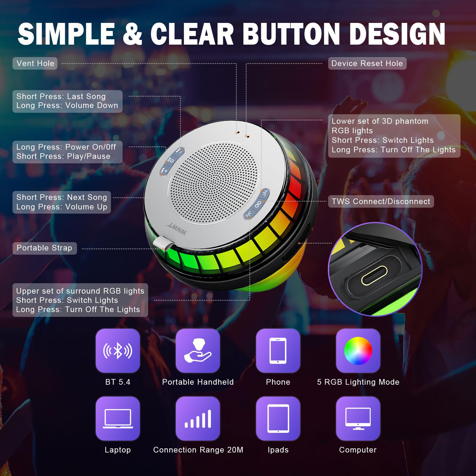 - [Combination of Light & Sound] – The floating speaker for pool provides five vigorous lighting models to create atmospheres! Dynamic and static lighting provides mild, enchanting atmospheres; mild light colors and changes help you relax, and the flickering lights changing with music beats can enhance your overall experience. With 360° stereo, the hot tub lights makes each note clear, appealing, full of sense of depth