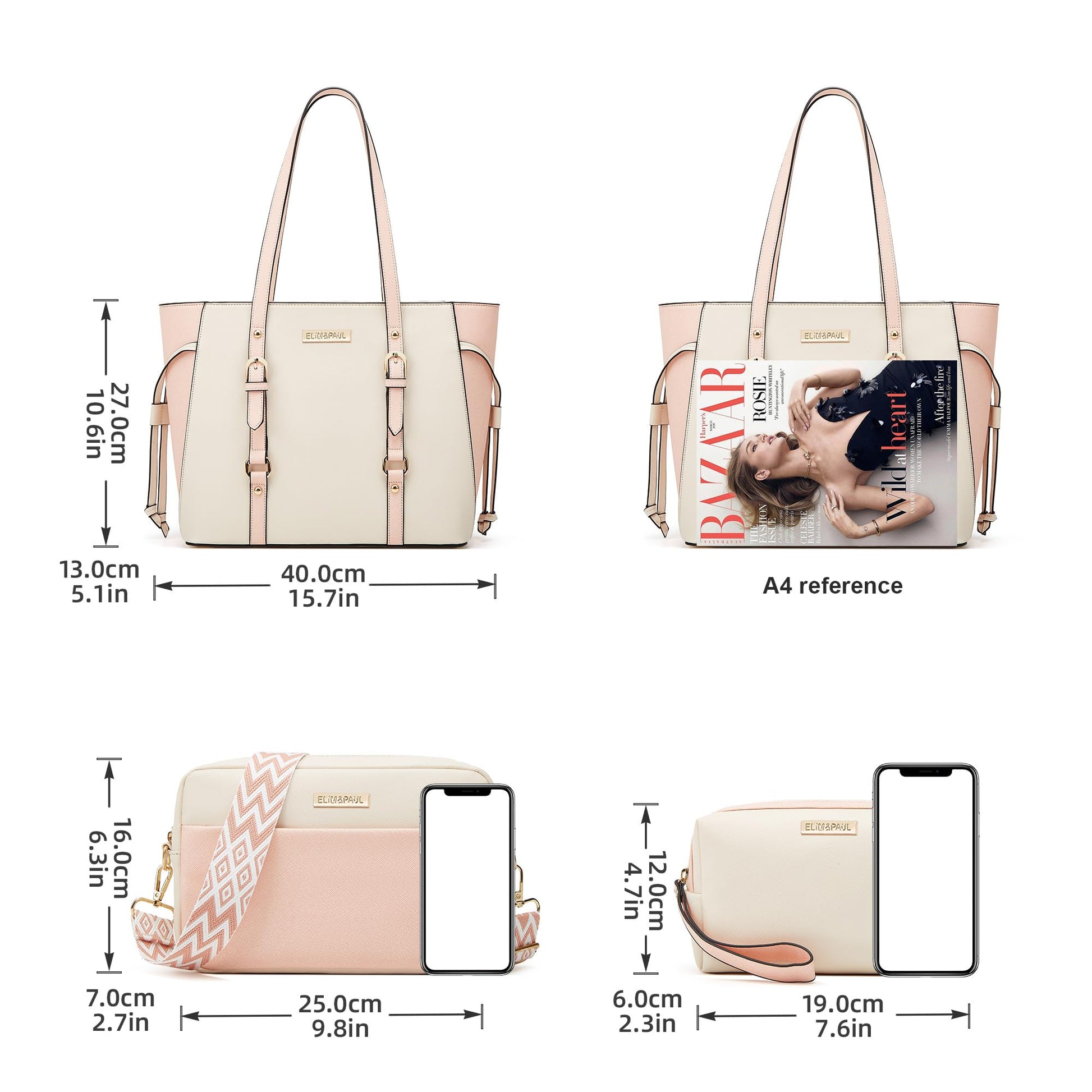Dimension: Large handbag: Top Width: 40CM,Bottom Width:30CM. Height: 27CM, Depth: 13CM. Crossbody Bag: Width: 26CM, Height: 15CM, Depth:8CM. Cosmetic Bag: Width:19CM, Height:13CM, Depth:7CM. Total weight: About 0.95kg.Please you can refer to the size before you buy it. Thank you.