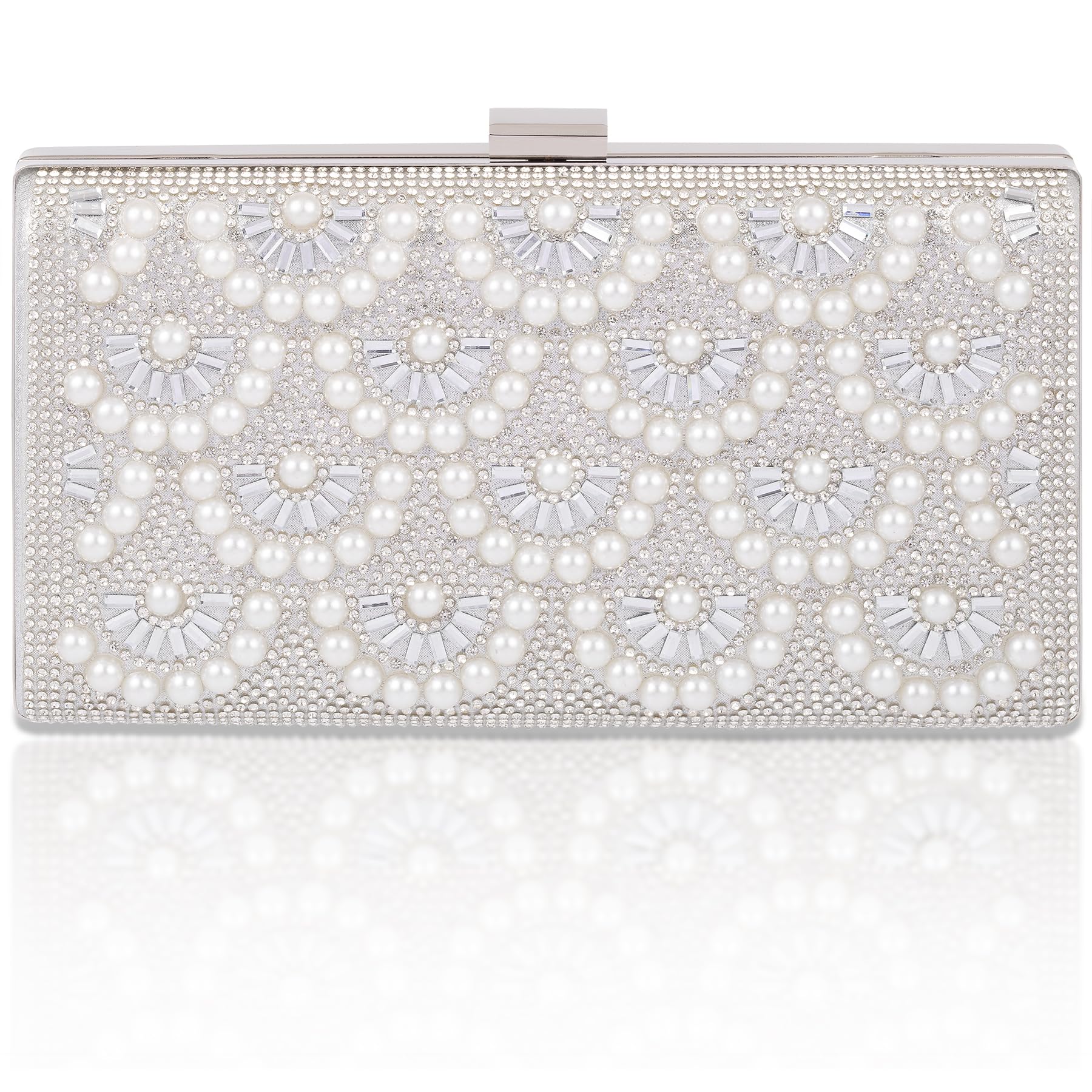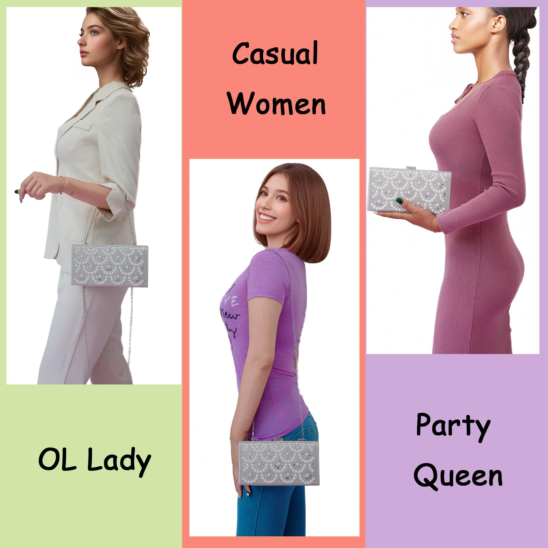 Women's Evening Clutch Handbags - Crossbody Purses Rhinestone Bag with Chains for Womens Ladies Girls Wedding Party, Sparkly Pearl Shoulder Clutches Bag Silver