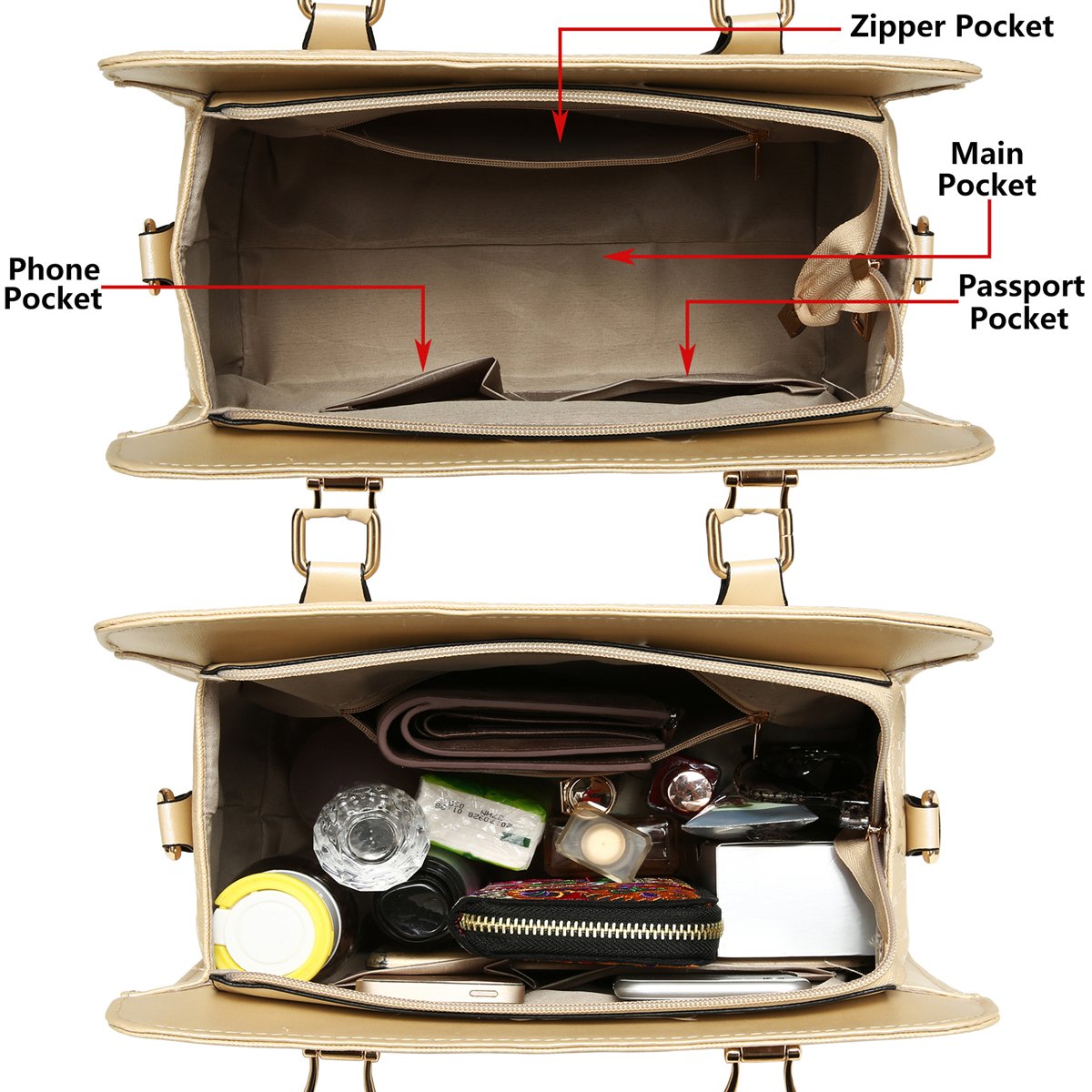 - DESIGNS: Top zipper closure. Decorated with top handles are very comfortable for carrying. Detailed with high quality gold tone hardware, zippers, flat bottom studs. It can be used as a women tote bag, daily purse, shoulder bag, top handle bag, work bag etc.