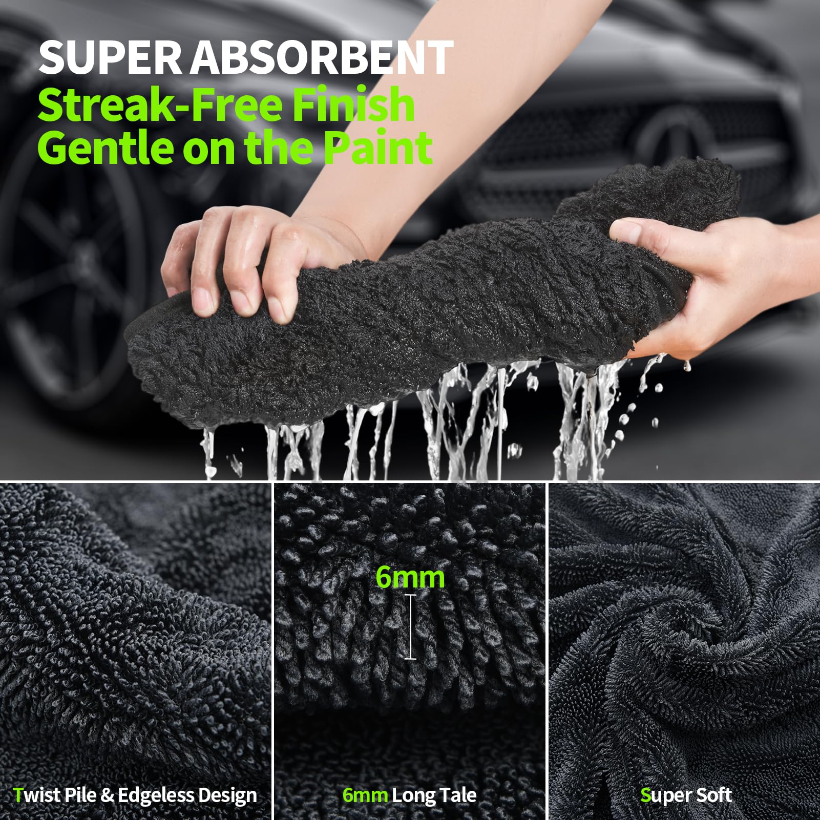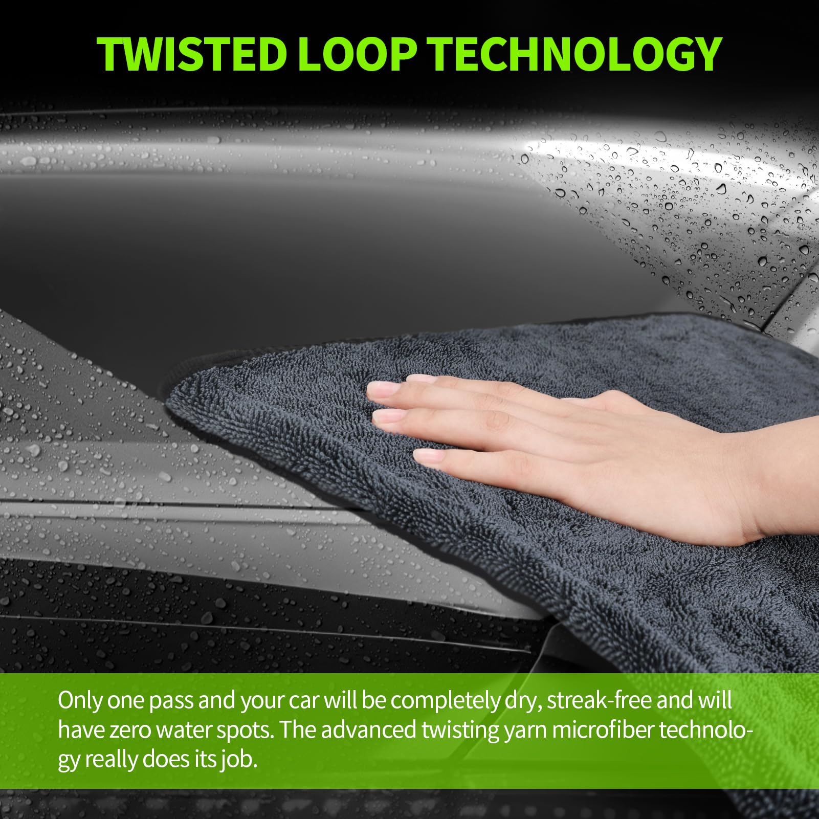 - 【NO WATER SPOTS OR STREAKS FREE】 - Only gently pass and your car will be 100% dry, streak-free and will have zero water spots. Our Twisted Loop Technology allows the towel to glide across the surface of your car and pick up every single drop of water. Saving your time and effort. The soft PE-edged microfiber material is gentle on the paint, ensuring a scratch-free finish every time. After several washes, they maintain their absorbency and softness, proving to be durable and long-lasting.