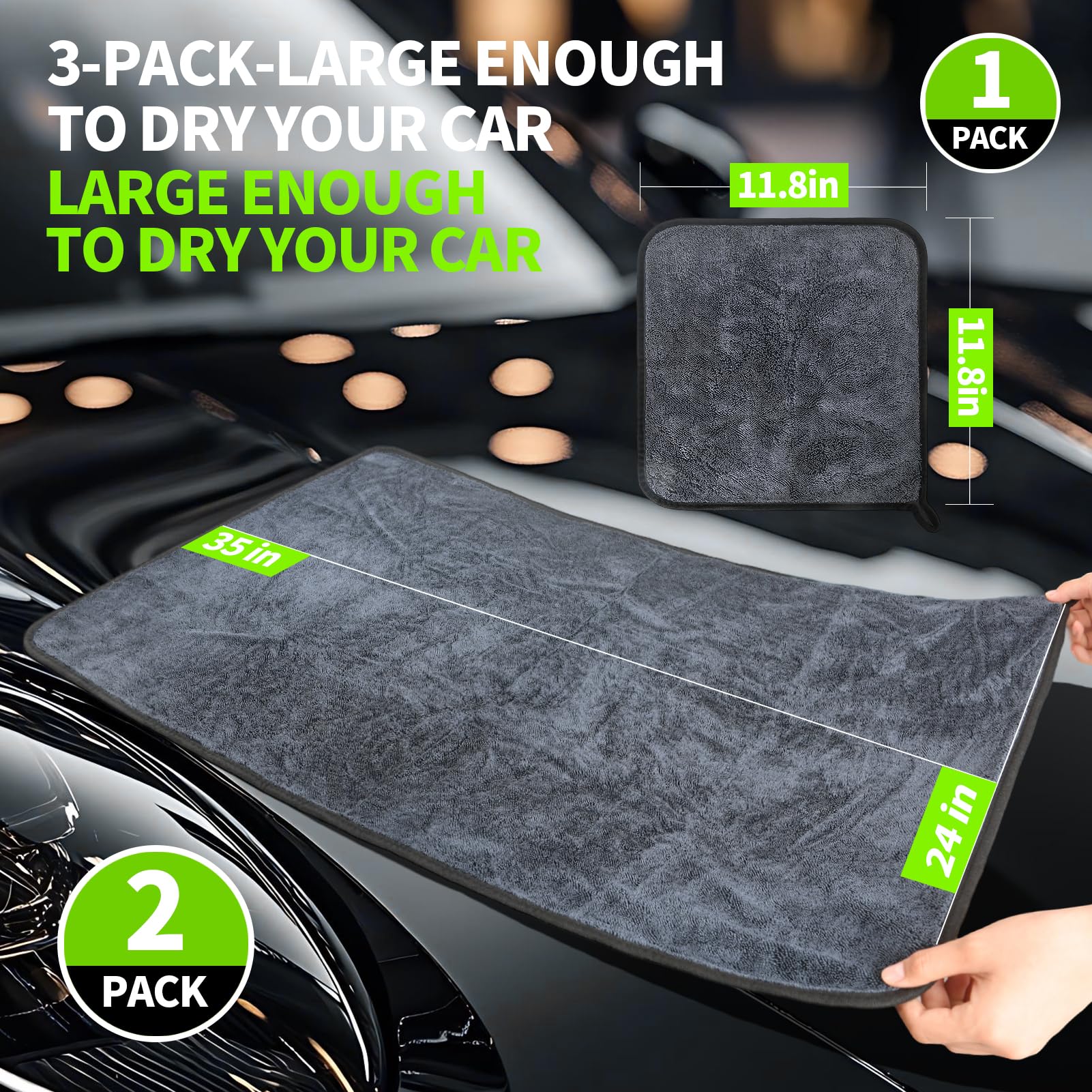 - 【VERSATILE SIZE】- You will get 2 pack 24*35 inches, and 1 pack 11.8*11.8 inch drying towels for car detailing. The 24x35 inches towels allowing it to quickly dry the surface area of your vehicle. Not only is it huge, but it glides across your vehicle without scratching the paint at all. You can use 11.8*11.8inch towels to clean tight spaces or car interior details.