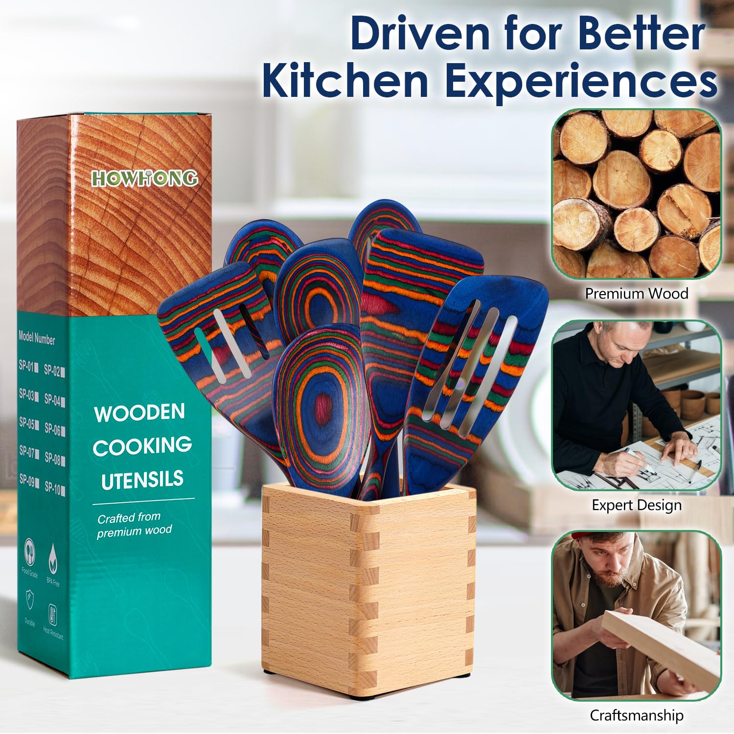 Wooden Spoons for Cooking, 7 Pcs Pakkawood Wooden Kitchen Cooking Spoon Utensil Tools Set Includes Spatula Corner Spoon Rice Paddle Friendly to Non-Stick Cookware by HOWHONG (Spectrum)