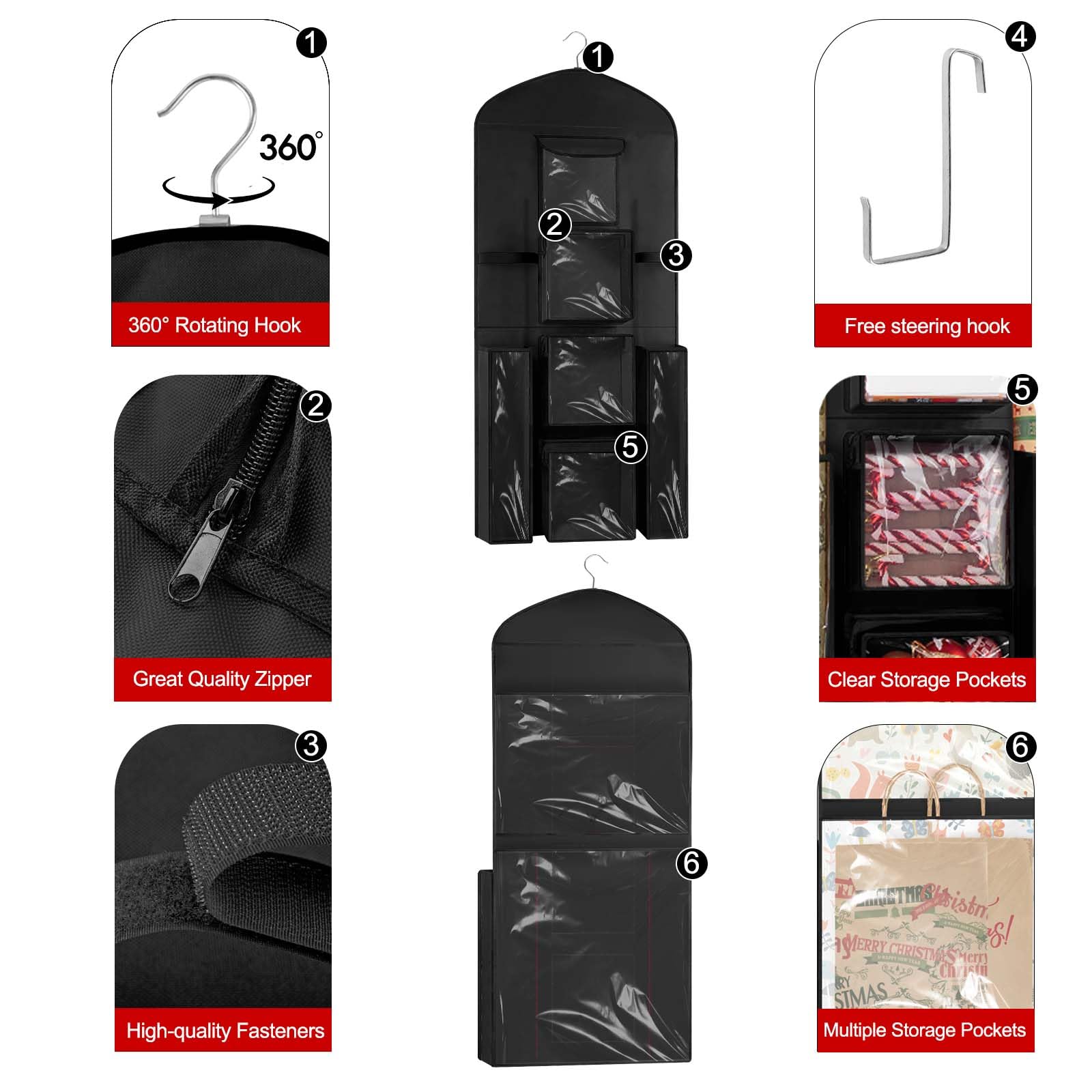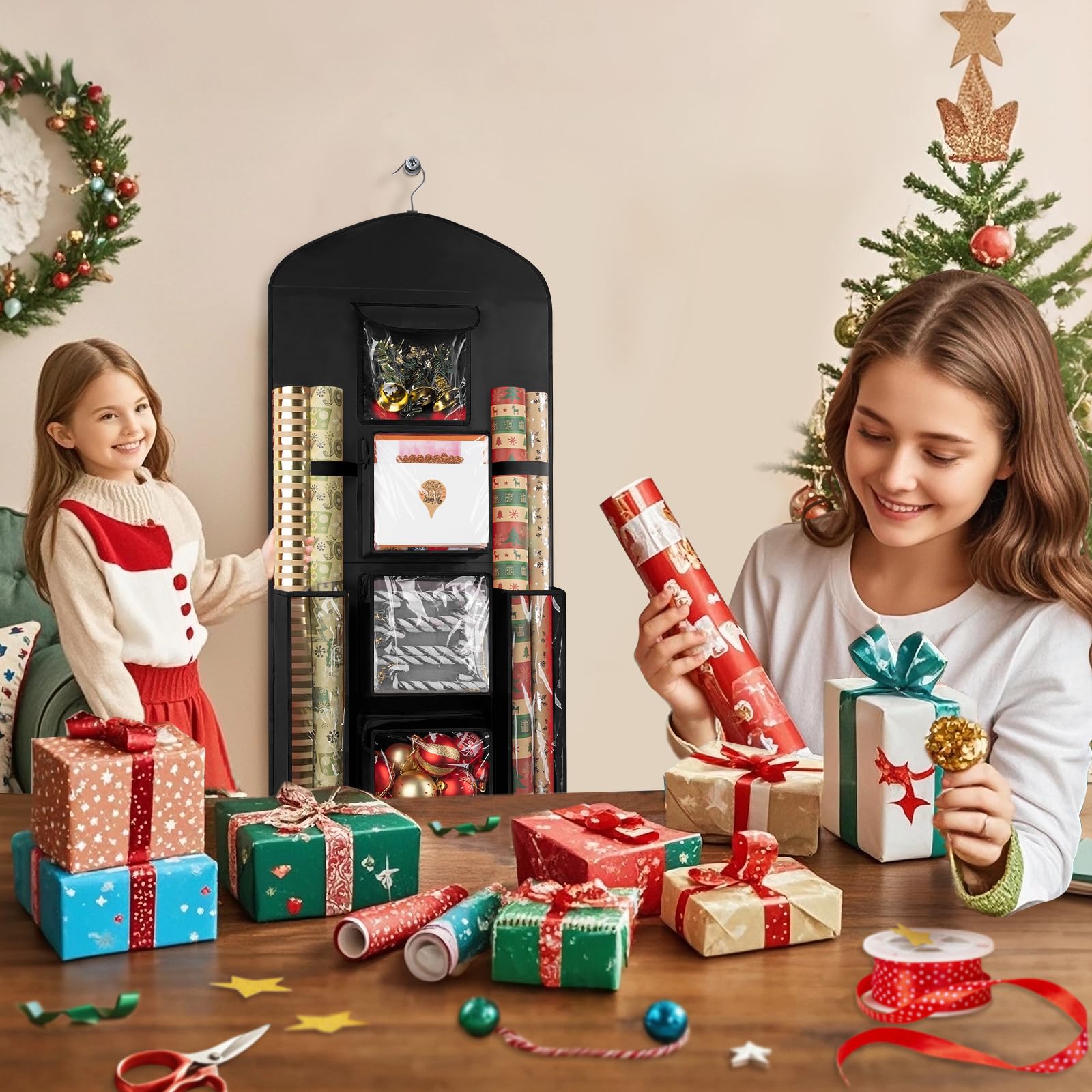 Woodoulogy Hanging Gift Wrapping Paper Storage, 40"X17" Black Double-Sided Christmas Wrapper Bag Container, Oxford Craft Roll Organizer, Present Wrap Holder for Bedroom Closet, Door, Cabinet