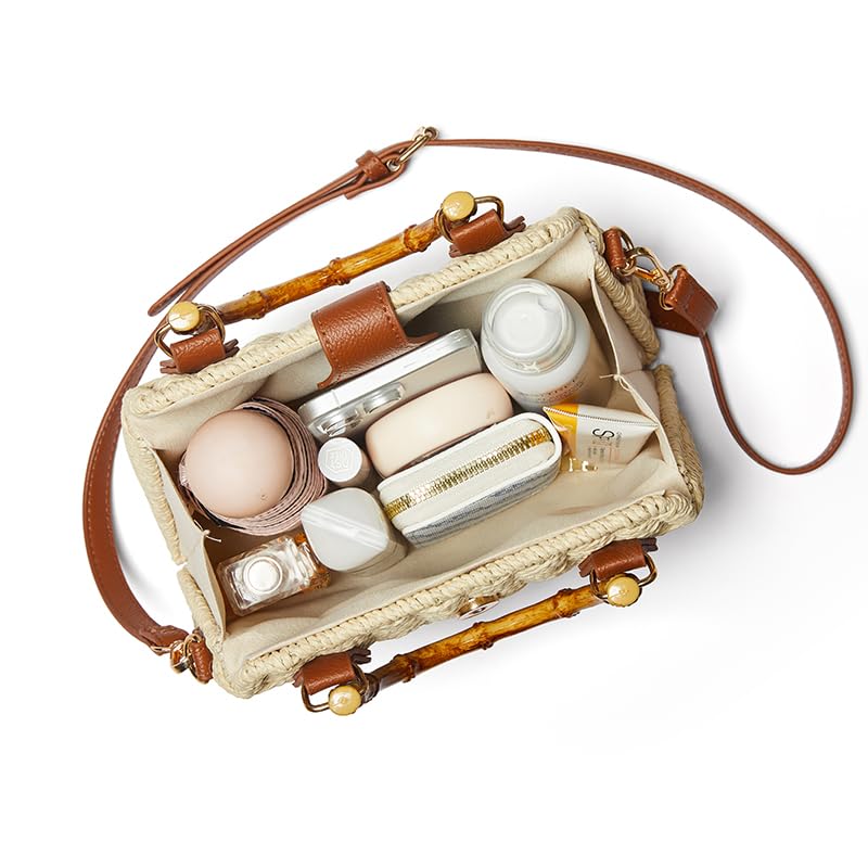 - VERSATILE CARRY: Features both a classic bamboo top handle and an adjustable leather crossbody strap for multiple carrying options