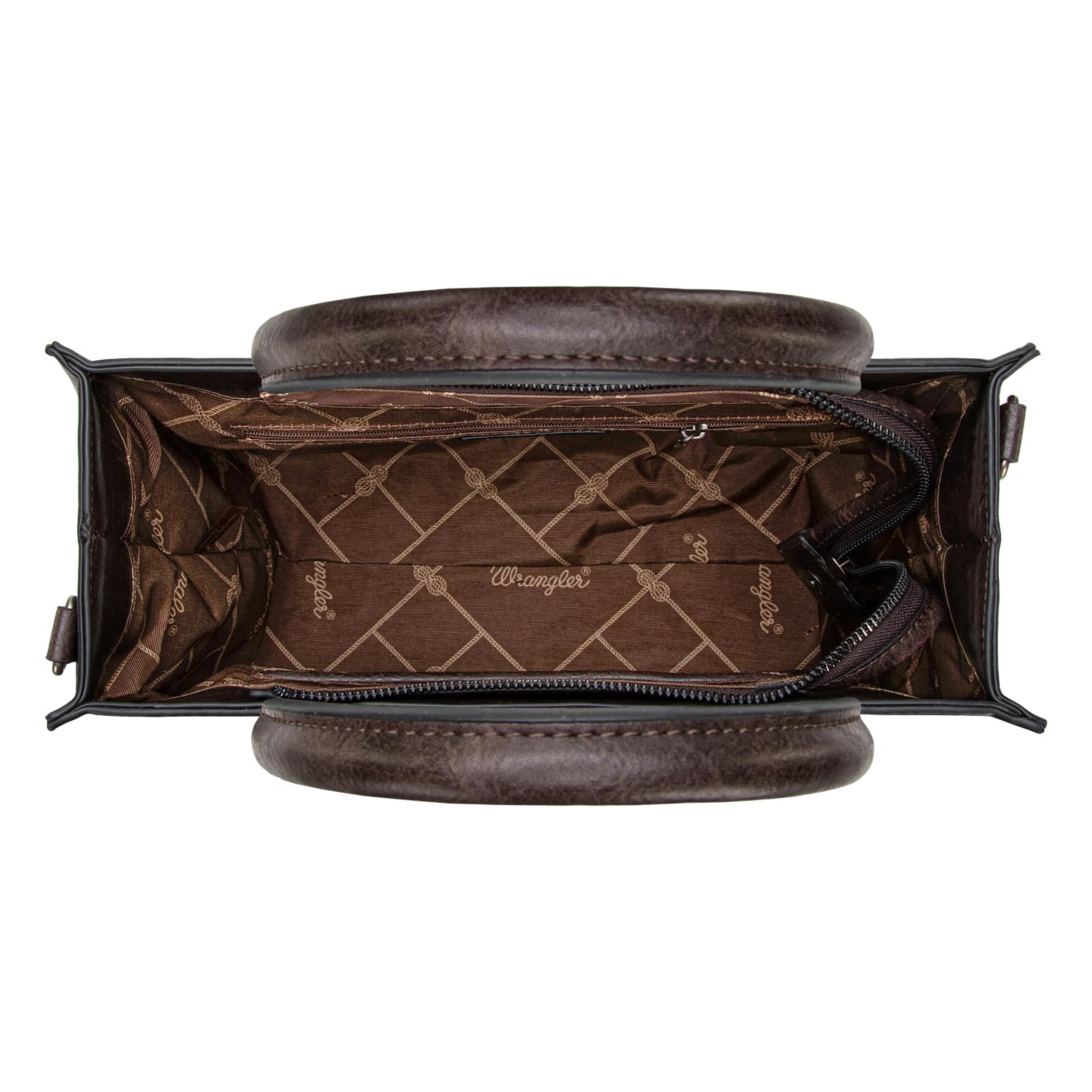 - Capacity: The Wrangler large tote features a top zipper closure and an interior zippered compartment with 1 open pocket and 1 zippered pocket, and comes with a detachable shoulder strap. The crossbody bag interior features a spacious center compartment.