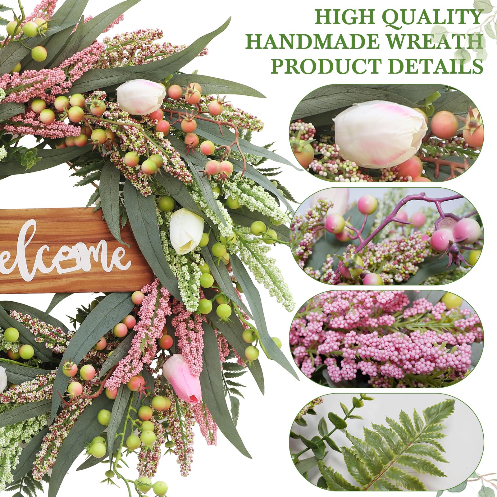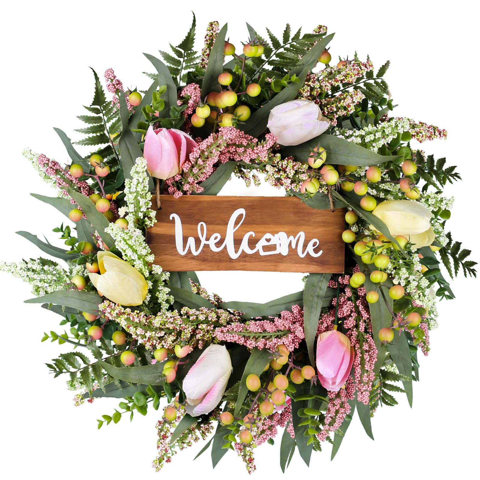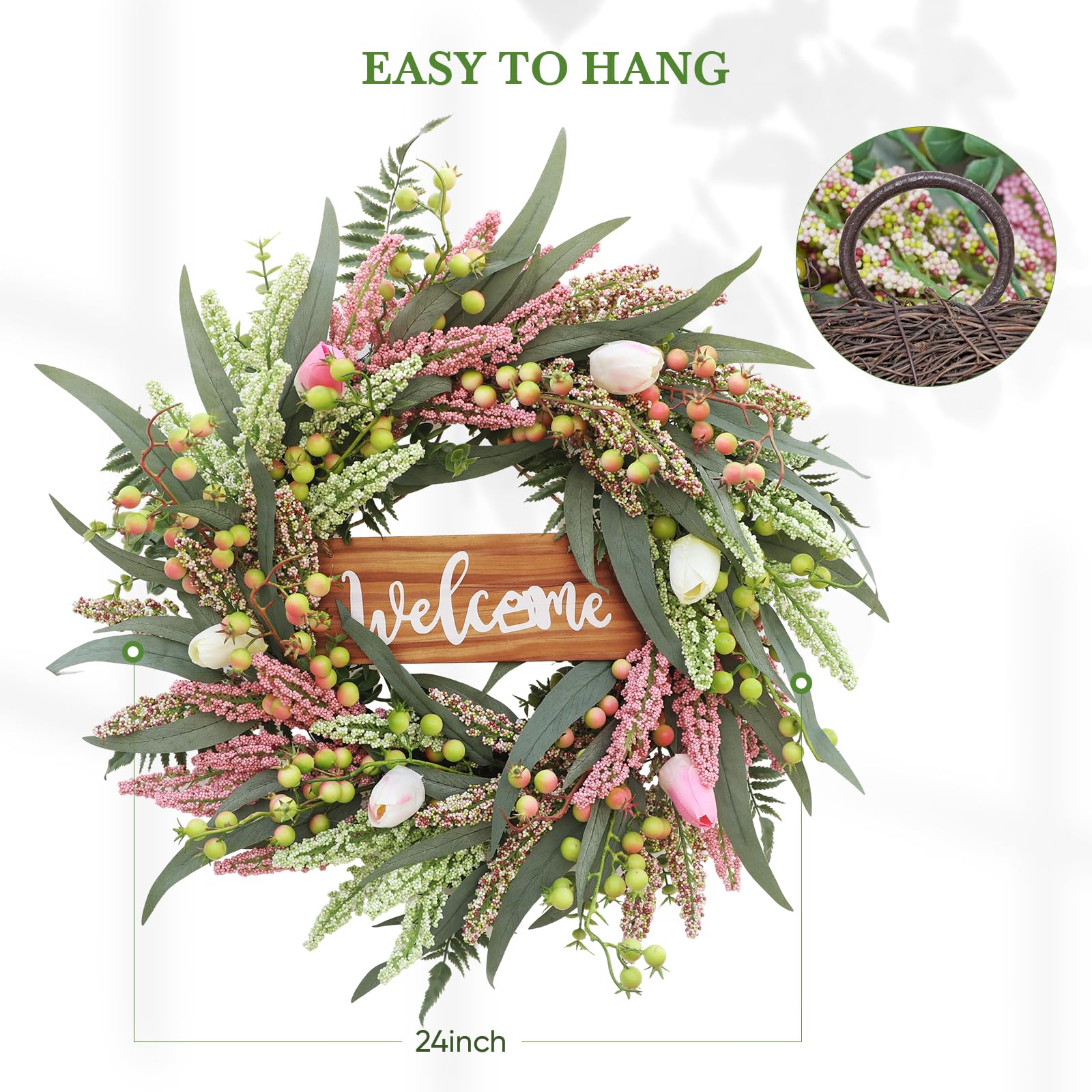 Wreaths for Front Door 24 Inch Spring Summer Tulip Wreath withTulip,Berries,Boxwood and Cattails Welcome Door Wreath, Porch, Window Green Decor for Home, Farmhouse - Spring, Summer, Fall, All Seasons