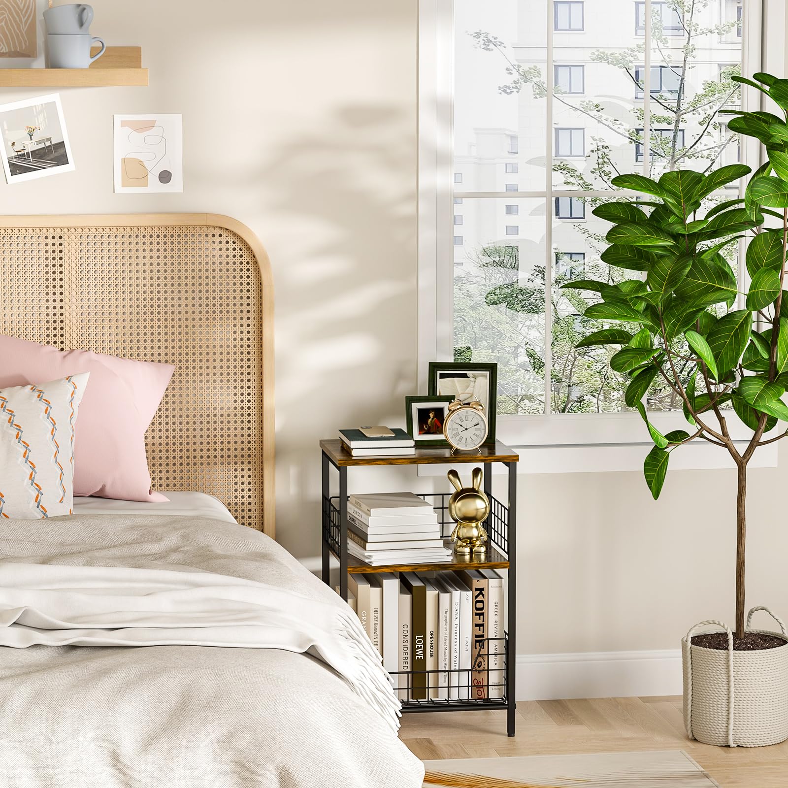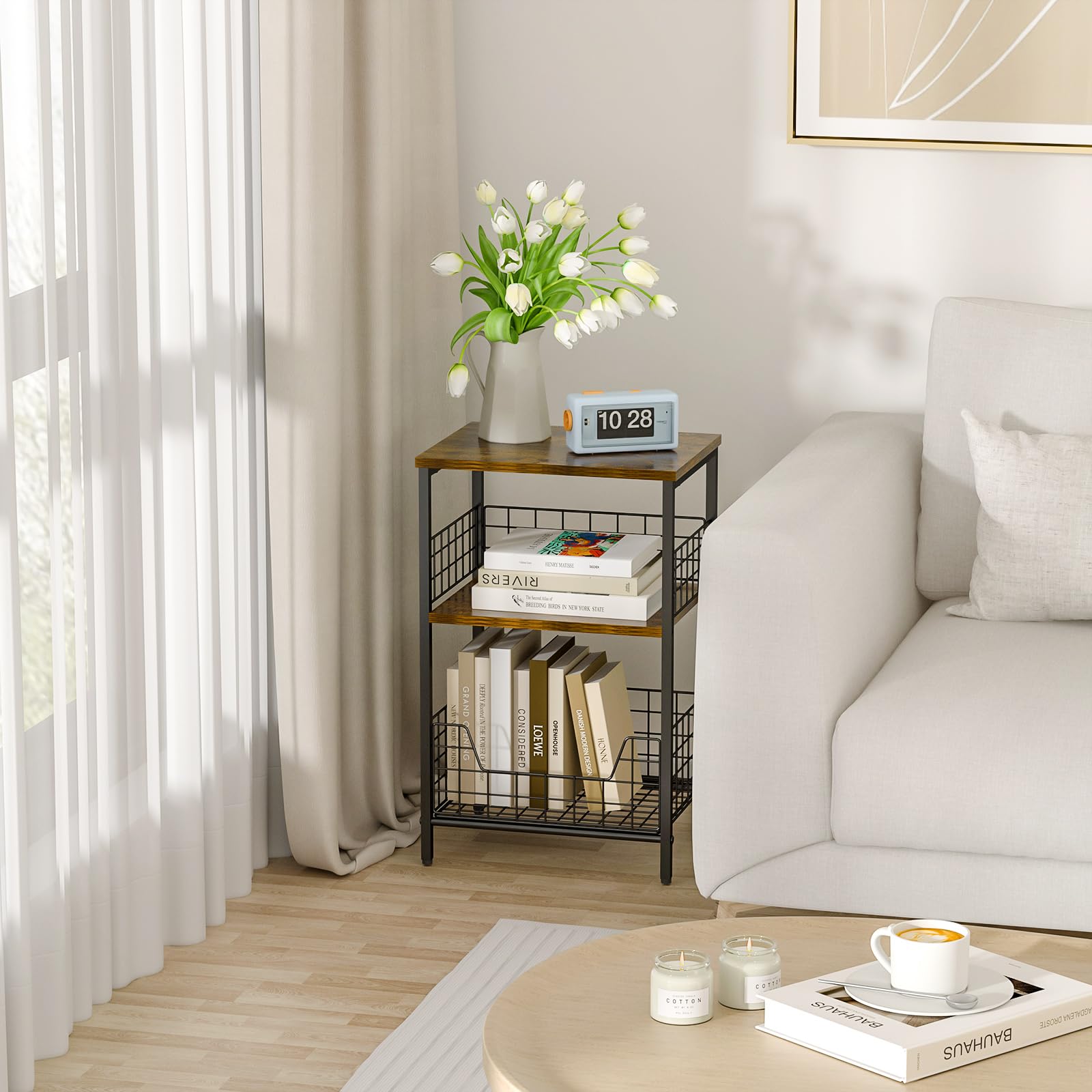 - 【More Practical】3-Tier end table for additional storage meet all of your different needs.The top and middle open smooth shelf gives sufficient storage place for storing and displaying. And the bottom wide U-shape iron wire basket for easy access and can storage snacks,cans or other stuff you want to put inside.