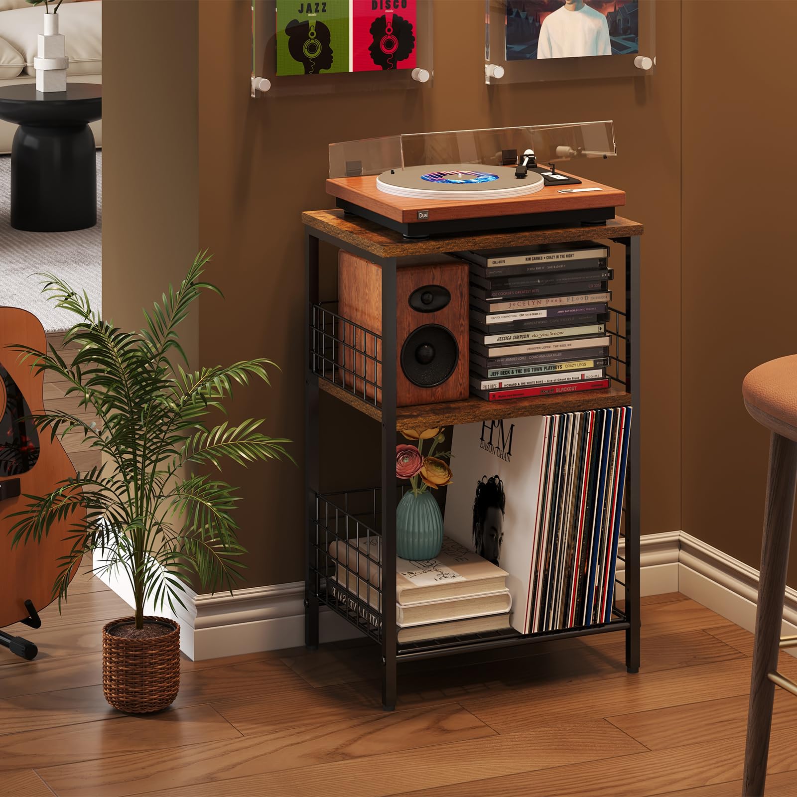 - 【3 Tiers Record Player Stand】This vintage-inspired stand features 3 tiers, including a spacious tabletop suitable for various record player sizes. Further, the 3rd open storage shelves can hold up to 100 albums, providing a categorized storage solution that combines artistry and practicality. 【Warm Tip】If the bottom is used for records, don't install the front wire fence.
