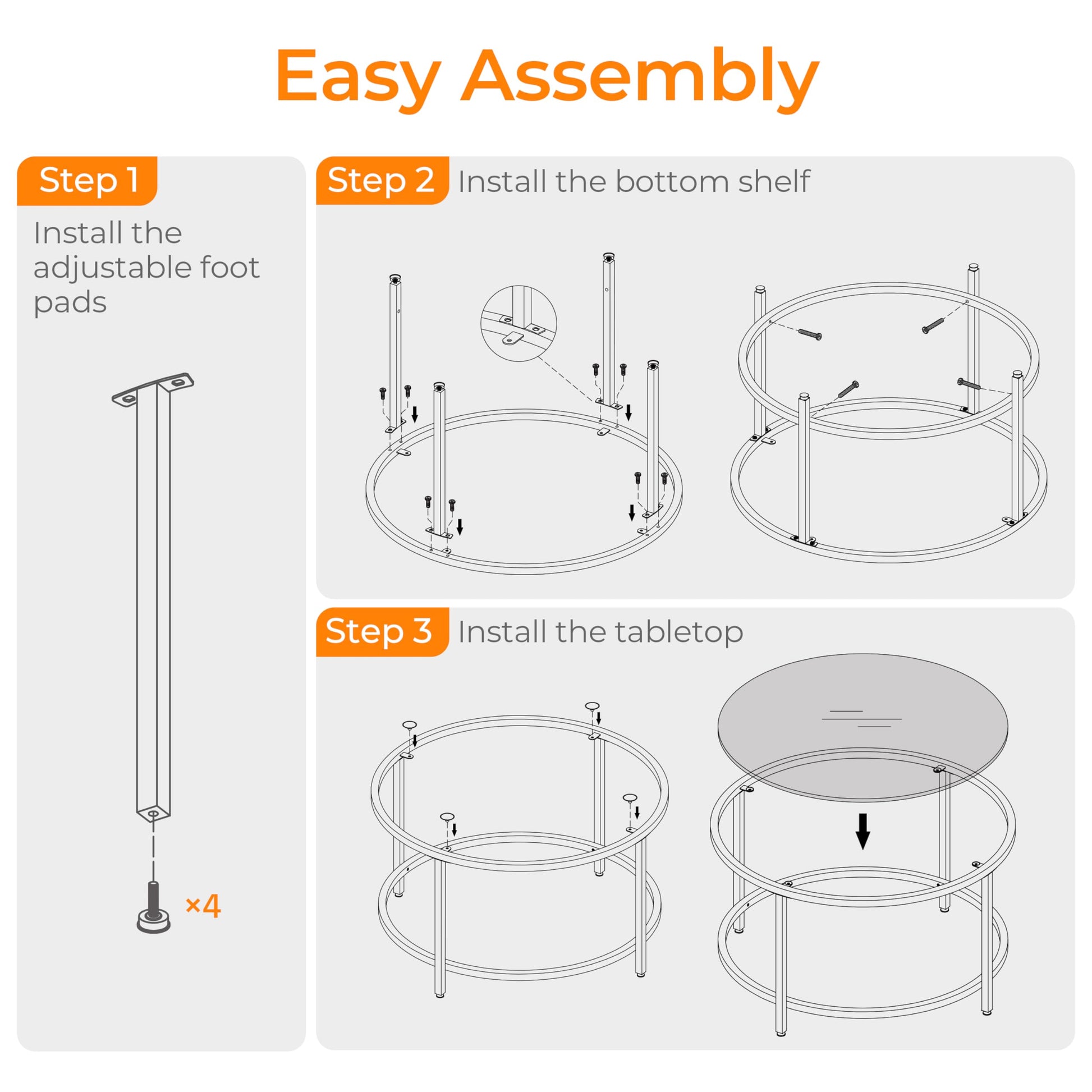 - Easy Assembly: This glass circle coffee table super easy to put this coffee table together. All necessaries and instructions are accompanied in the package and the table has been well-packaged for better protection
