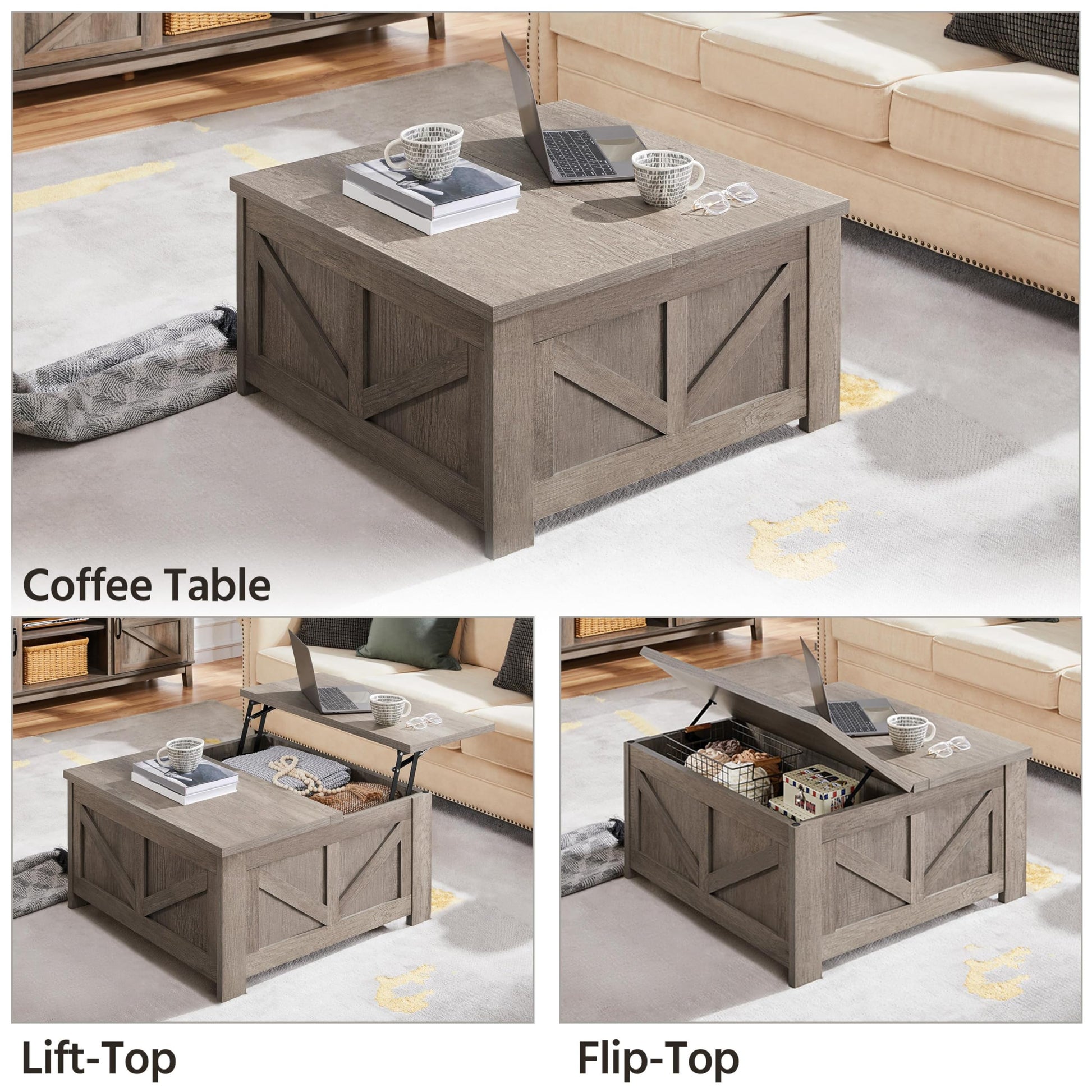 - Farmhouse Coffee Table: This grey square farmhouse coffee table boasts a spacious 31.5 × 31.5 inches (L×W) tabletop. This wooden coffee table splits into two sections – one flip top, one lift top, offering improved functionality and versatility