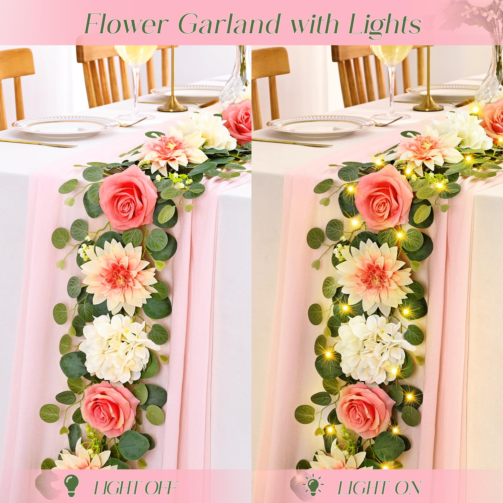 - Flower Garland with Lights: Each eucalyptus garland comes complete with 9.84 feet of LED lights offering two modes: flashing and constant. Beautiful pink flower garland with soft warm lights will illuminate your room, adding a warm and inviting ambiance to any setting, making it ideal for evening events or creating cozy spaces. (Requires 3 AA batteries, not included)