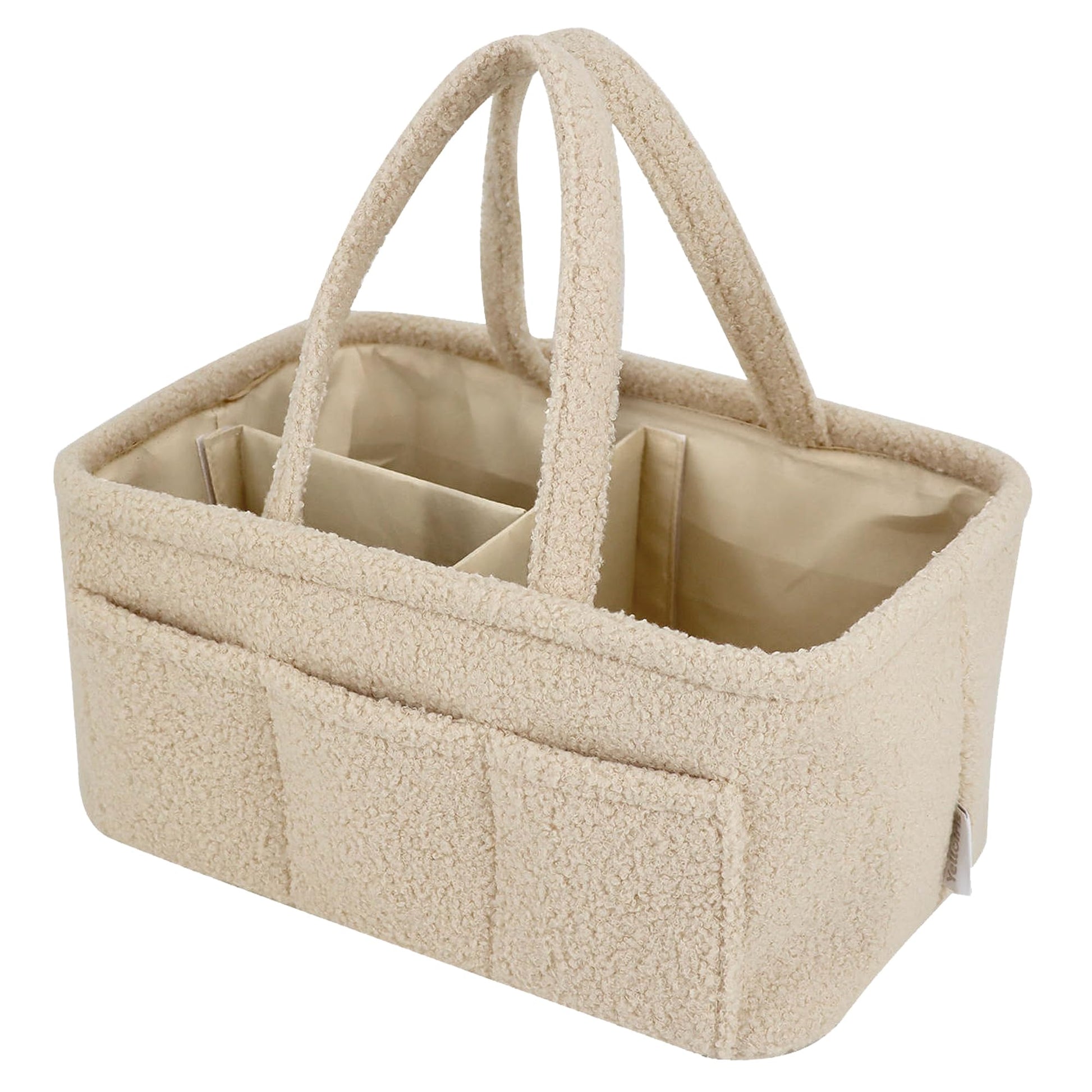 YelloIris Baby Diaper Caddy Organizer – Soft Beige Sherpa with 3 Removable Compartments & 6 Side Pockets – Perfect Nursery Storage Bin & Car Organizer for Diapers, Baby Wipes, and Essential Supplies.