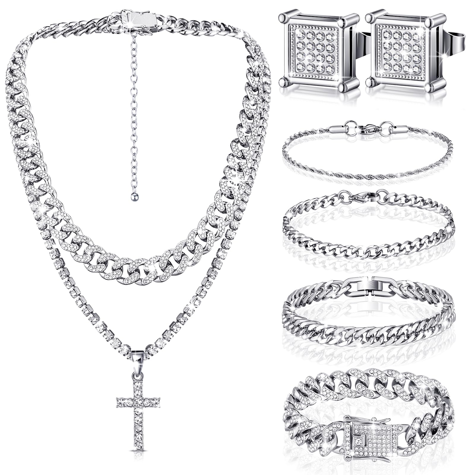 Yinkin 6 Pcs Hip Hop Jewelry Set for Men Rhinestone Link Chain Bracelet Earrings Tennis Diamond Jewelry Set for Men Gift (Silver)