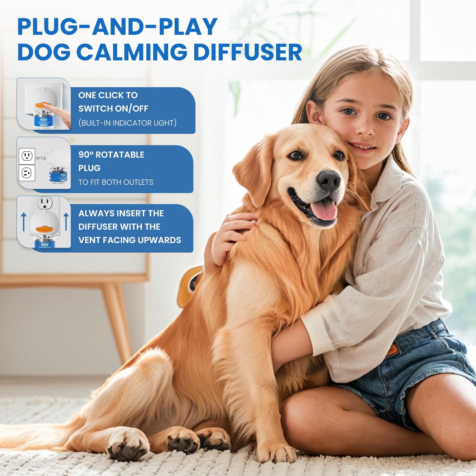 - Usage Precautions: When using, please insert the dog pheromones calming diffuser correctly and keep the vent facing up. When using a dog calming diffuser, it is normal for the dog diffuser to become slightly warm. To achieve the best results from a dog pheromone diffuser, place dog diffuser in an area where your dog frequently spends time. Avoid obstructions above the dog calming diffuser when using it