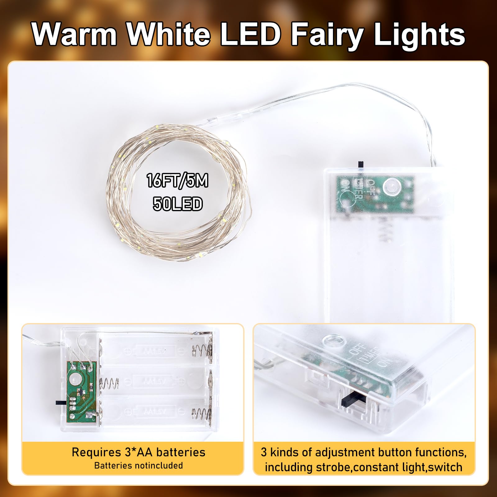 - 2 Pack of Fairy Lights: Fairy Lights Powered by 3 AA batteries (not included), each string of Fairy Lights has 16.4ft 50 energy-efficient Leds. The upgraded design has significantly extended the working hours of Fairy Lights.