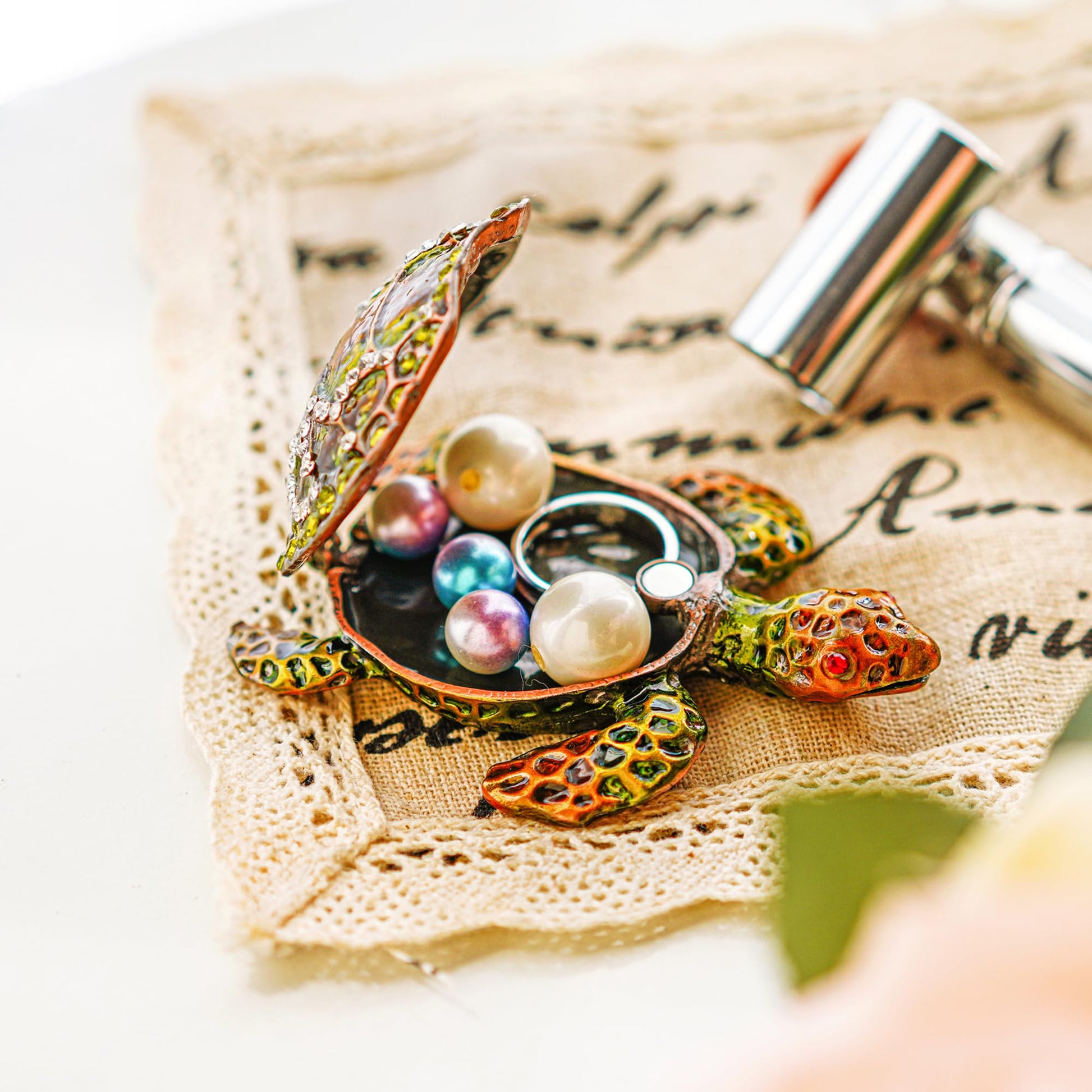 - Tiny cute sea turtle animal trinket box hinged with small storage space for your earrings, rings, necklace or other little trinkets.