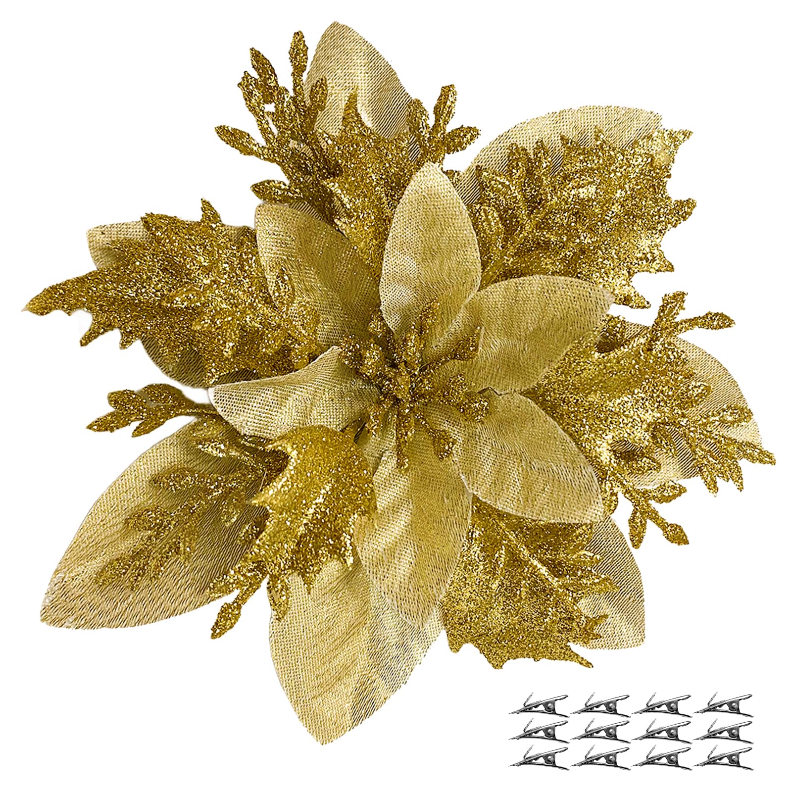 yuagolle Christmas Artificial Poinsettia Flowers: 12pcs Gold Poinsettia with Clips Silk Glitter Picks Fake Floral, for Decorations, Xmas Tree Decor, Wreath Garland Bulk, Wedding, New Year Ornaments