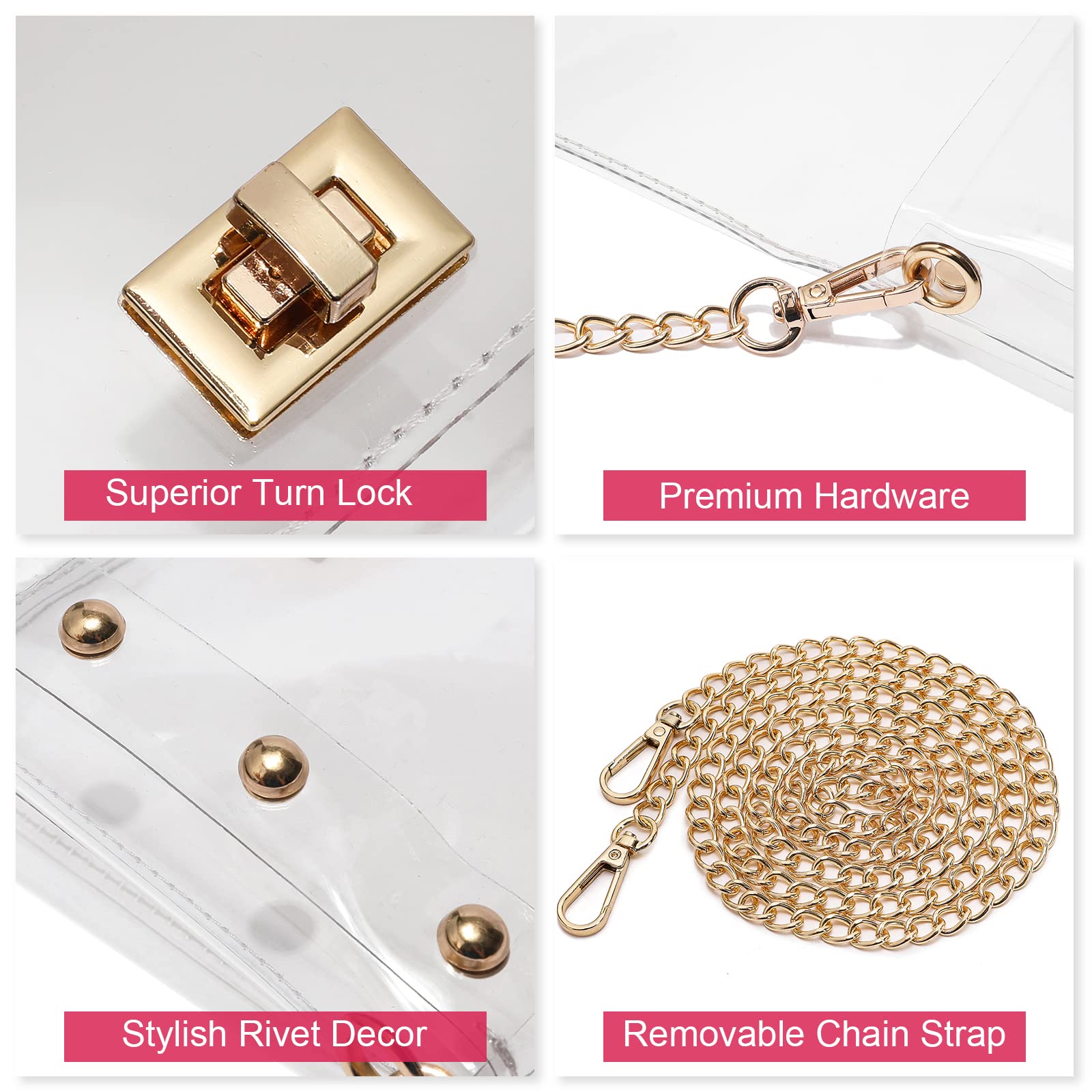 - 【Removable Long Chain】This gold removable long chain of clear bag is 47.2', this cute clear bag can be used as a shoulder bag, clear clutch or crossbody bag