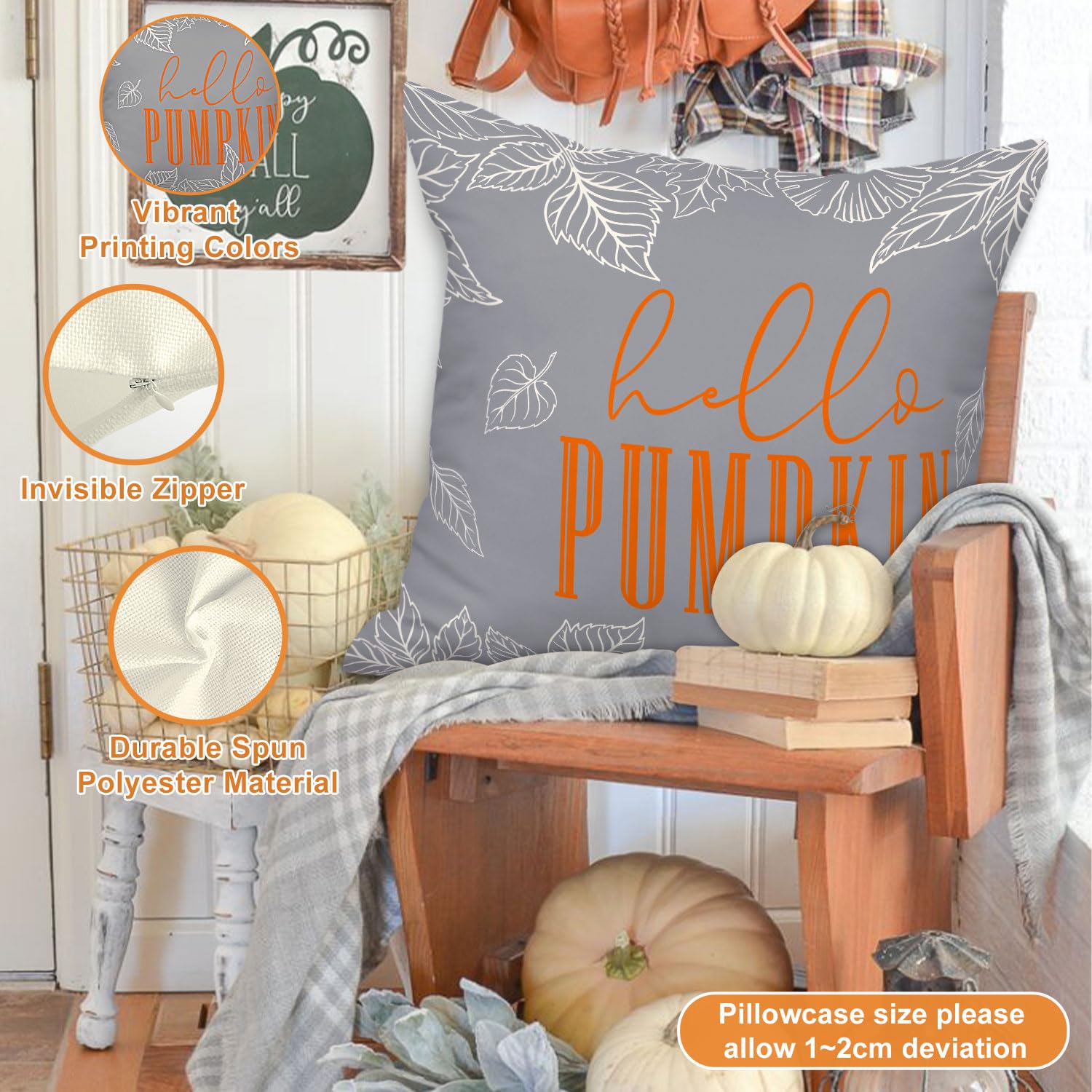 Ywlake 18x18 Fall Pillow Covers Set of 4, Hello Pumpkin Decorative Holiday 18 x 18 Autumn Cushion Covers Thanksgiving Pillow Case for Indoor Home Bedroom Couch Sofa Decor Grey