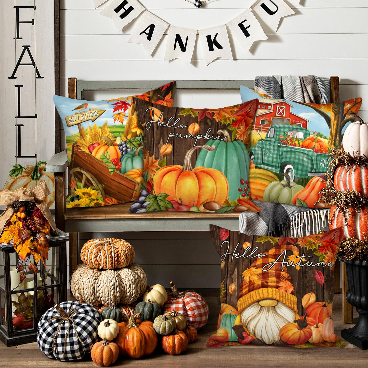 • Set of 4 18x18 Decorative Fall Pillowcases with clear prints pattern to help you quickly change up your fall decorations, perfect for fall harvest Thanksgiving Halloween decorations
