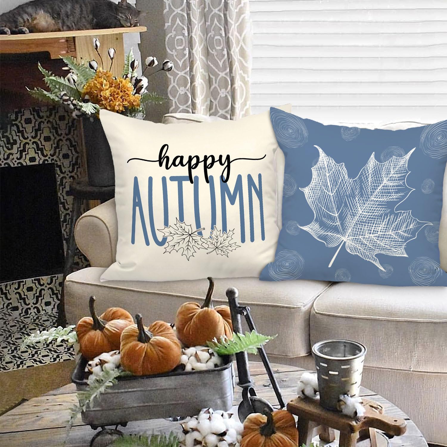 Ywlake Blue 18x18 Throw Fall Pillow Covers Set of 4, Maple Leaf Pumpkin Decorative Holiday 18 x 18 Autumn Cushion Covers Thanksgiving Pillow Case for Indoor Home Bedroom Couch Sofa Decor