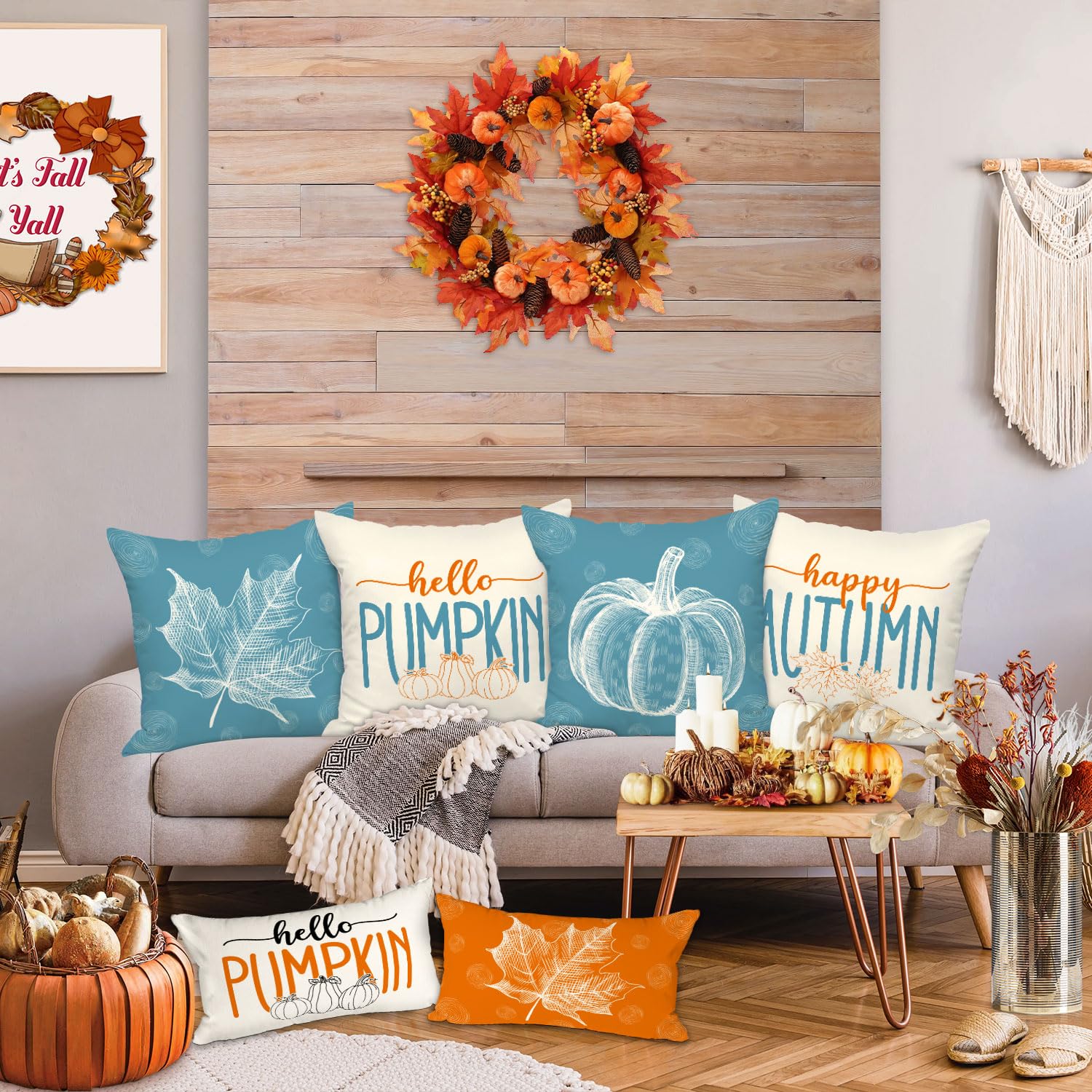 Ywlake Teal 18x18 Throw Fall Pillow Covers Set of 4, Maple Leaf Pumpkin Decorative Holiday 18 x 18 Autumn Cushion Covers Thanksgiving Pillow Case for Indoor Home Bedroom Couch Sofa Decor