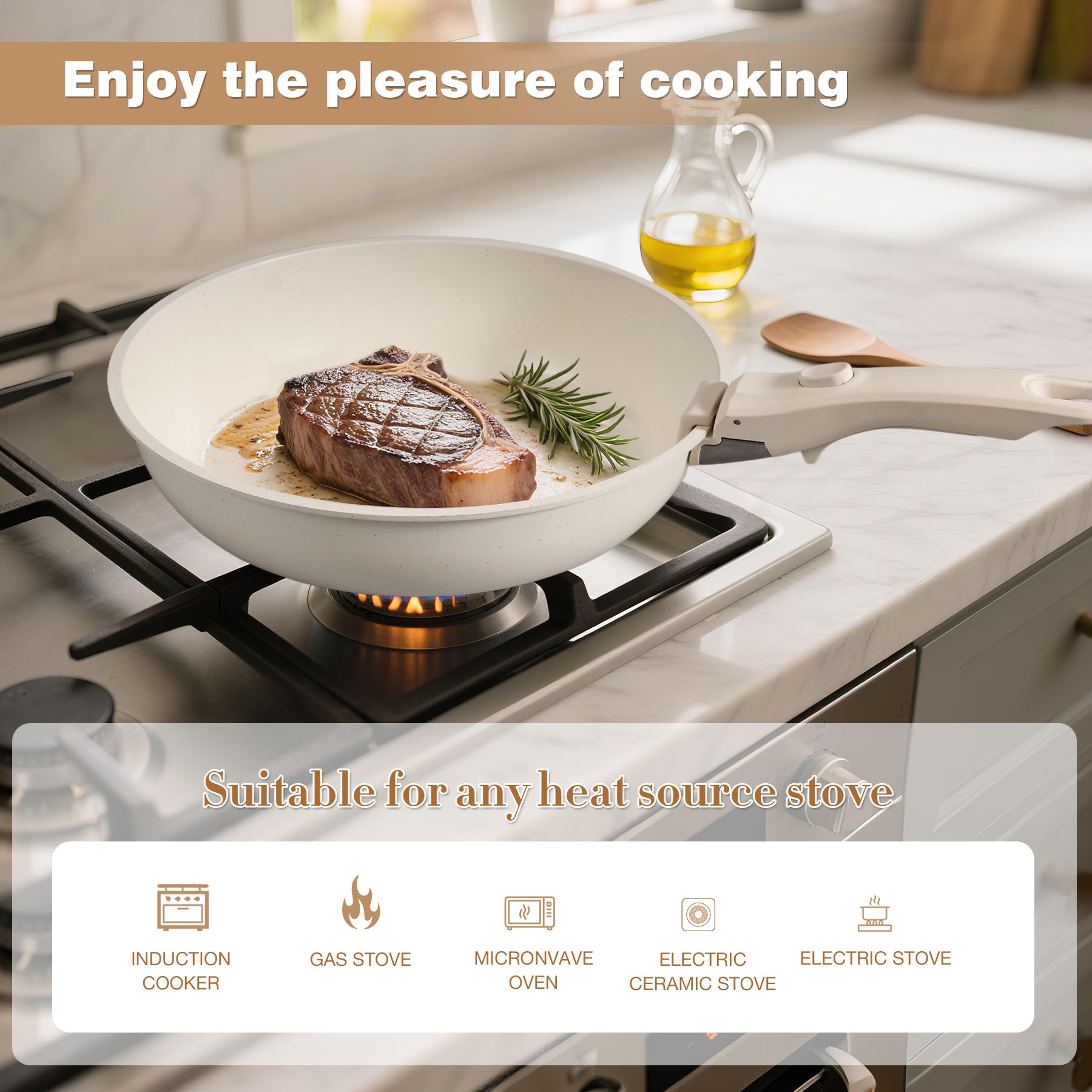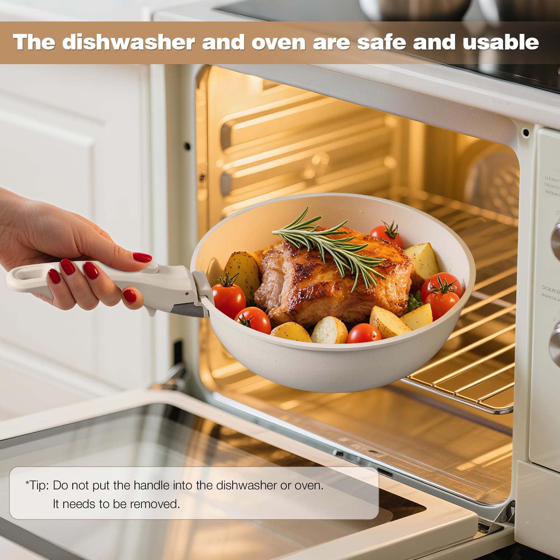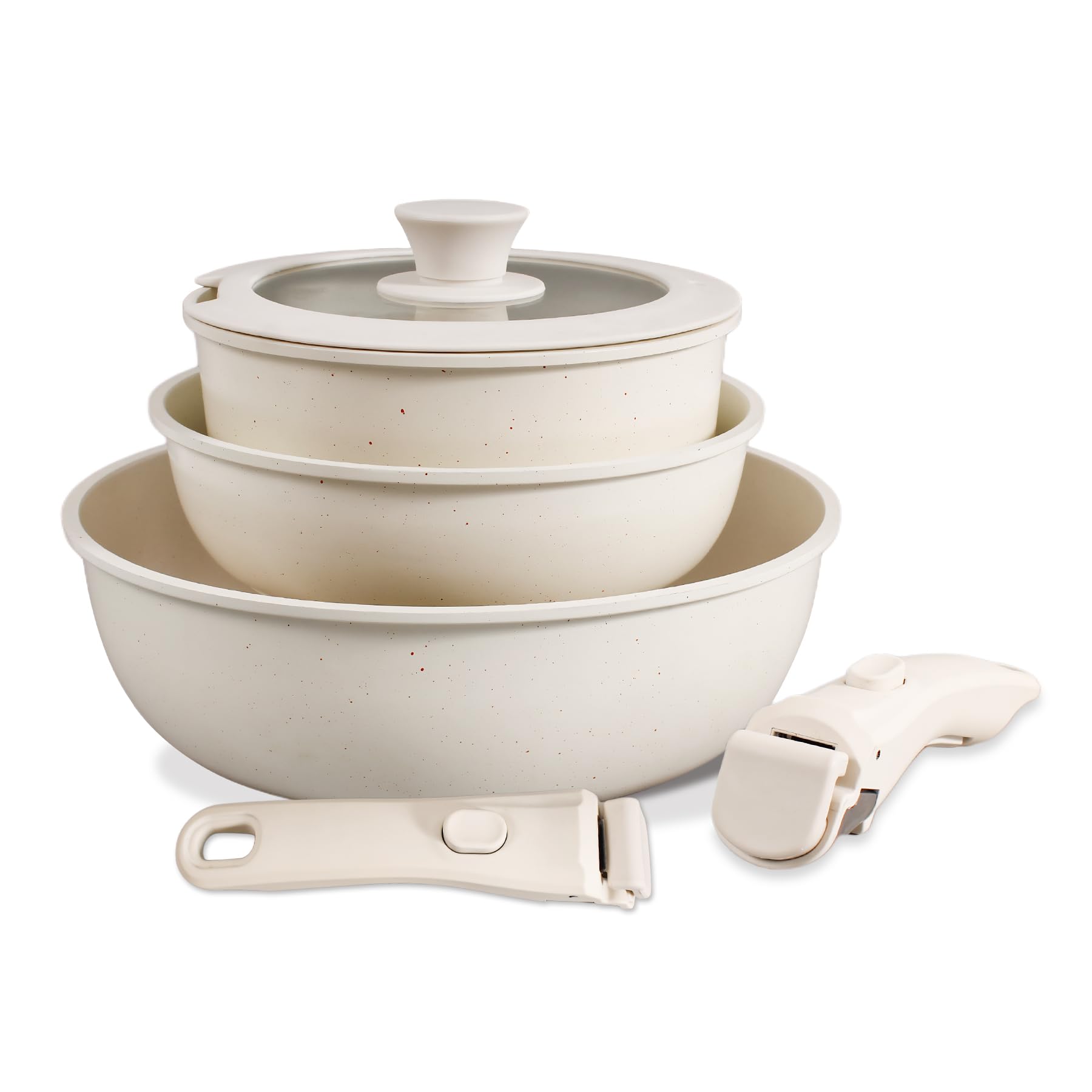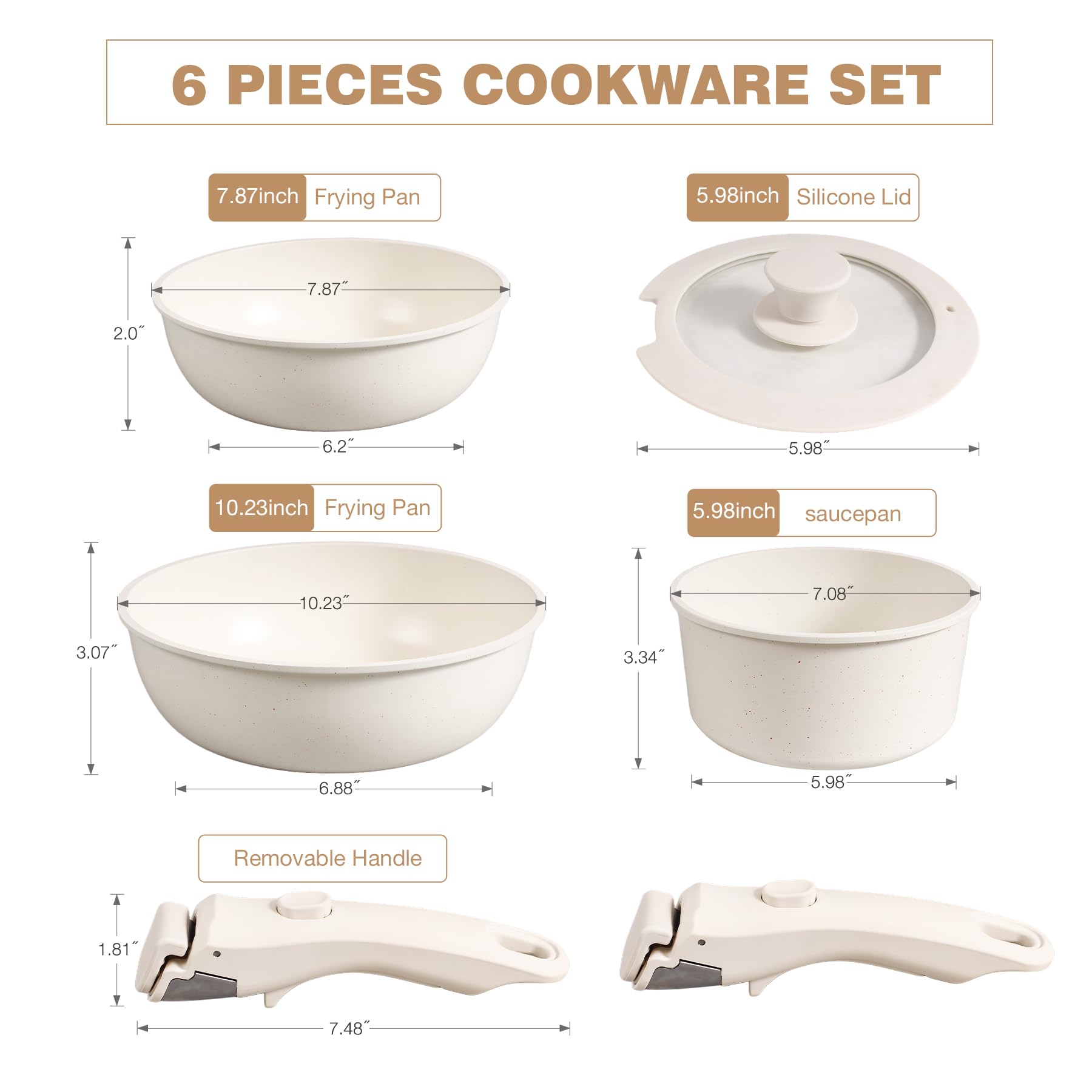 Zalnuuk 6 PCs pots and pans set non stick, Nonstick Kitchen Cookware Set, 2 Detachable/Removable Handles, Induction RV Kitchen Set, Oven Safe, Cream White