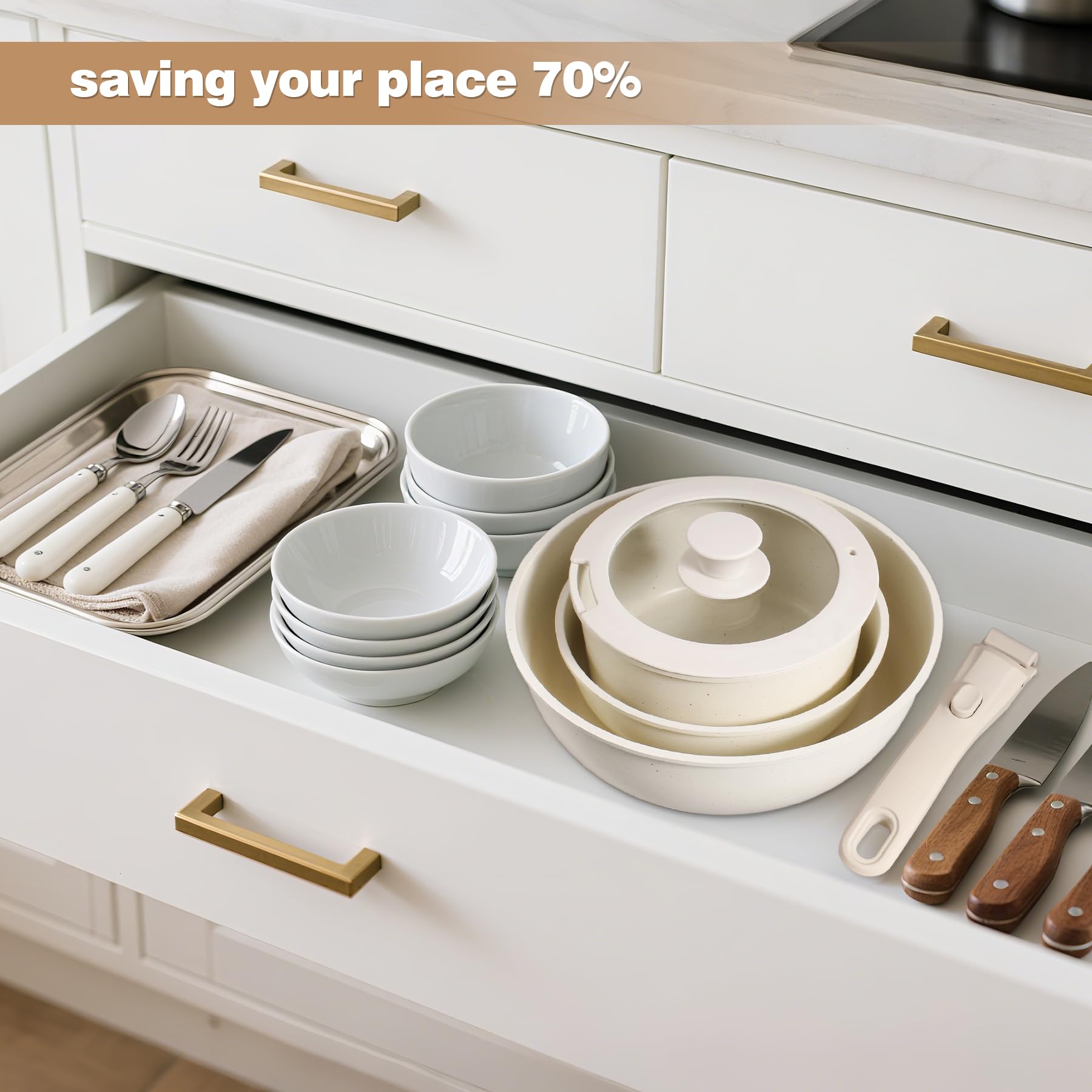 - 70% Space-Saving: Save up to 70% more space with stackable pots and pans set and detachable handles; Neatly stack all the pots and pans, saving 70% of cabinet space—keeping the kitchen organized and tidy; Perfect for compact kitchens and an ideal choice for RVs or campers