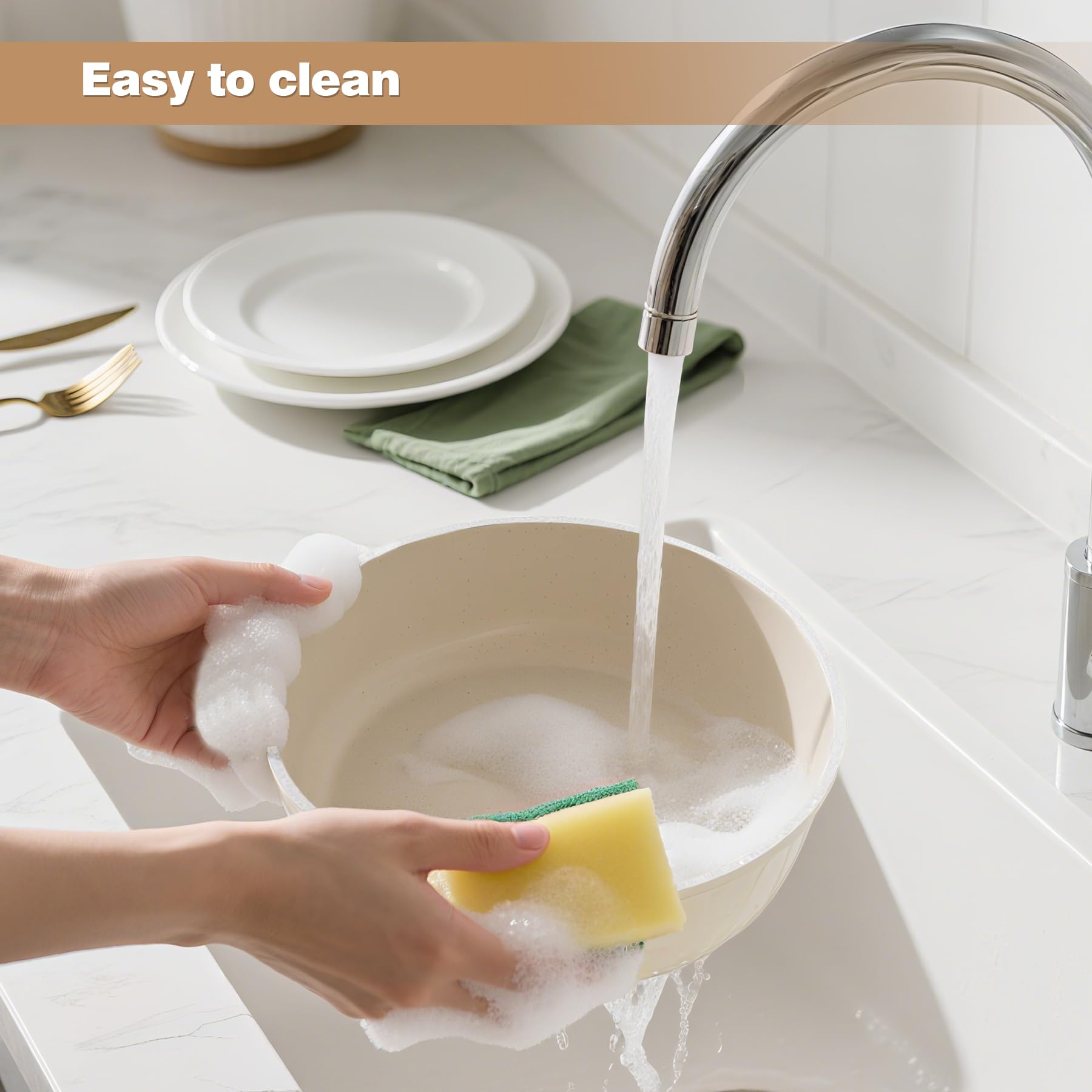 - Nonstick Material: Our cookware set's coating is made of natural ore and has excellent non-stick properties. PFOA free, smokeless, less oil, safe & healthy.