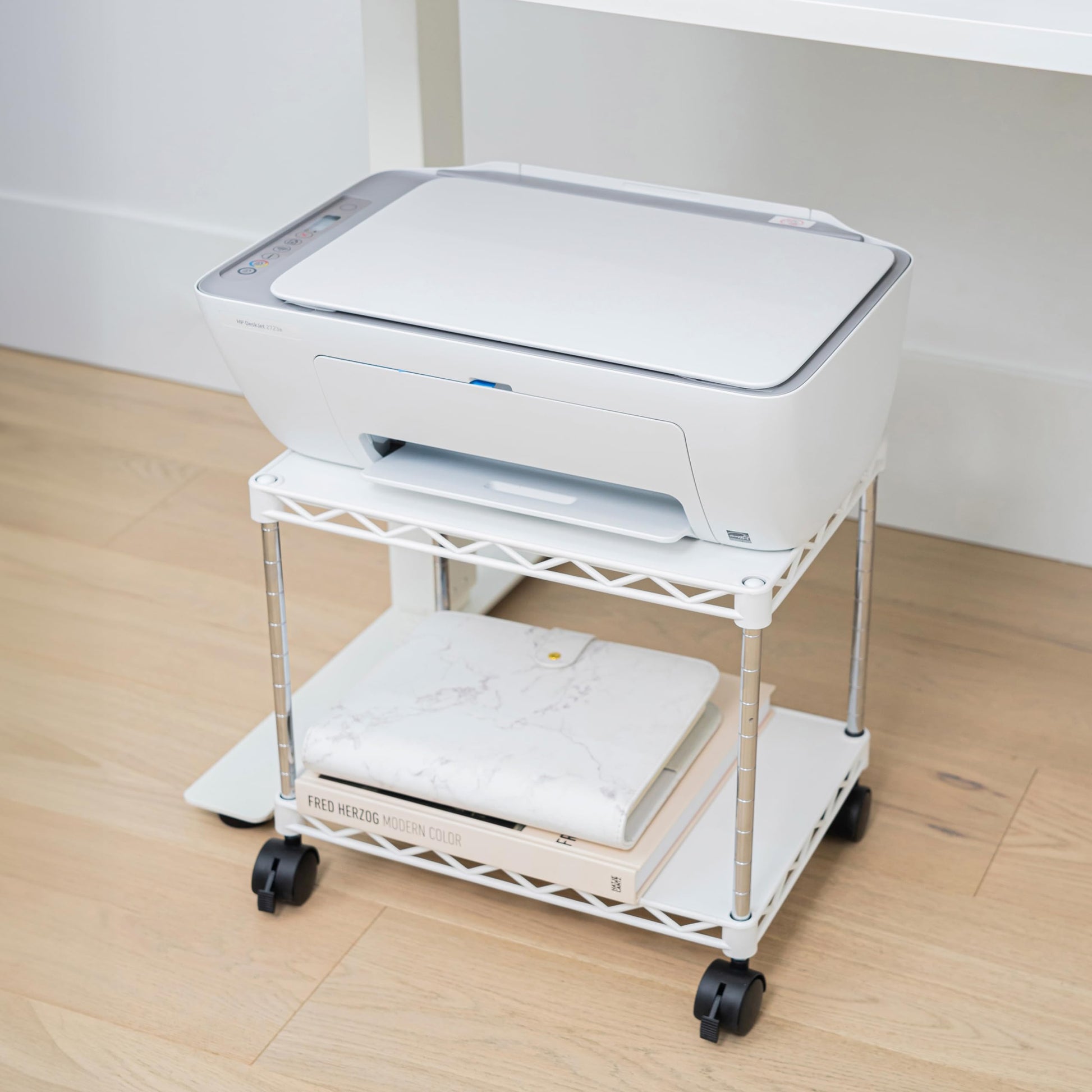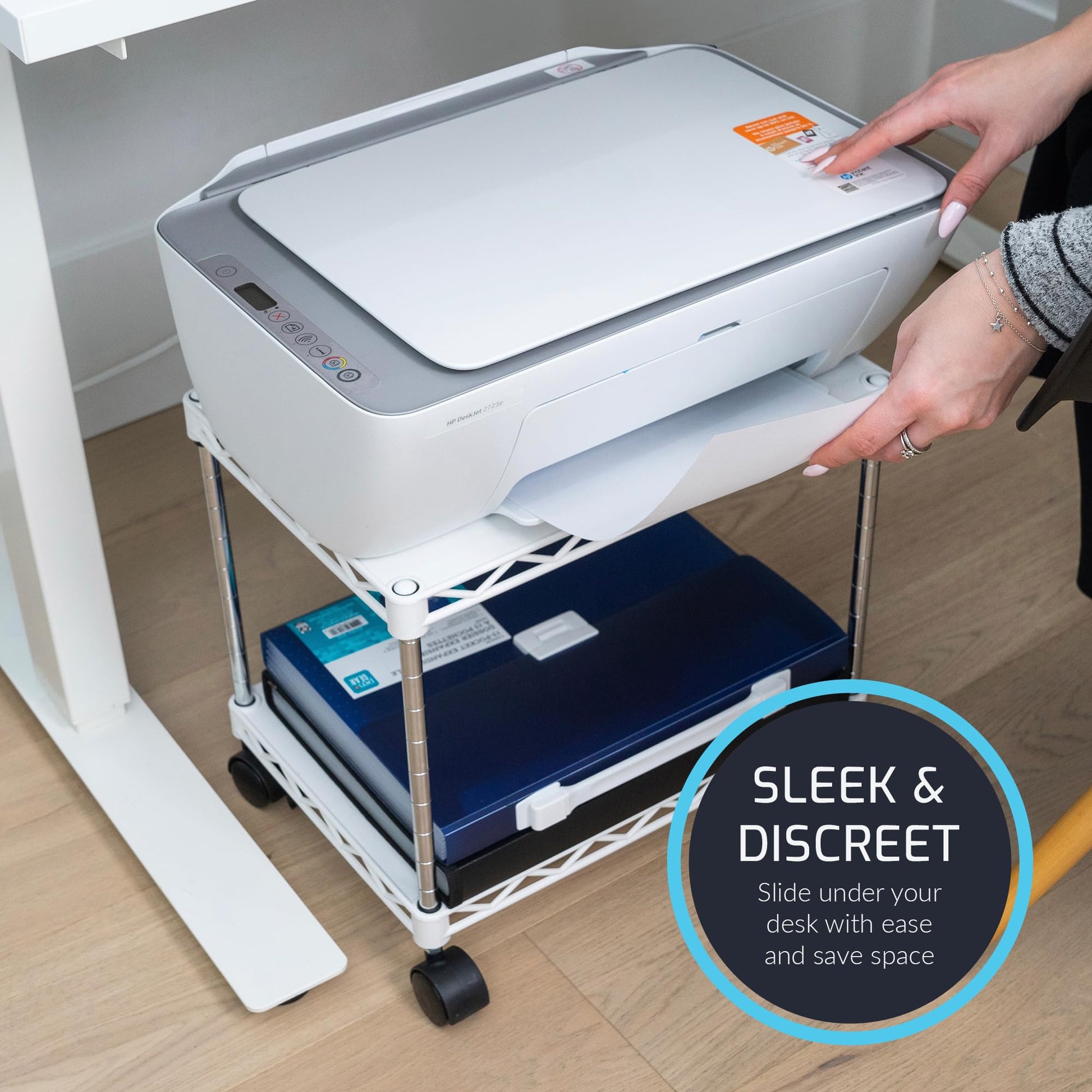 - SPACE SAVING COMPACT DESIGN: The Rolling Printer Stand holds small inkjet printers, scanners and fax machines within easy reach, but off your desktop. The cart is designed to fit under desk table, freeing up valuable floor and table space. The bottom shelf holds paper, toner or other supplies for quick access. If you have a small home office with a small printer footprint, the Mini is just for you.
