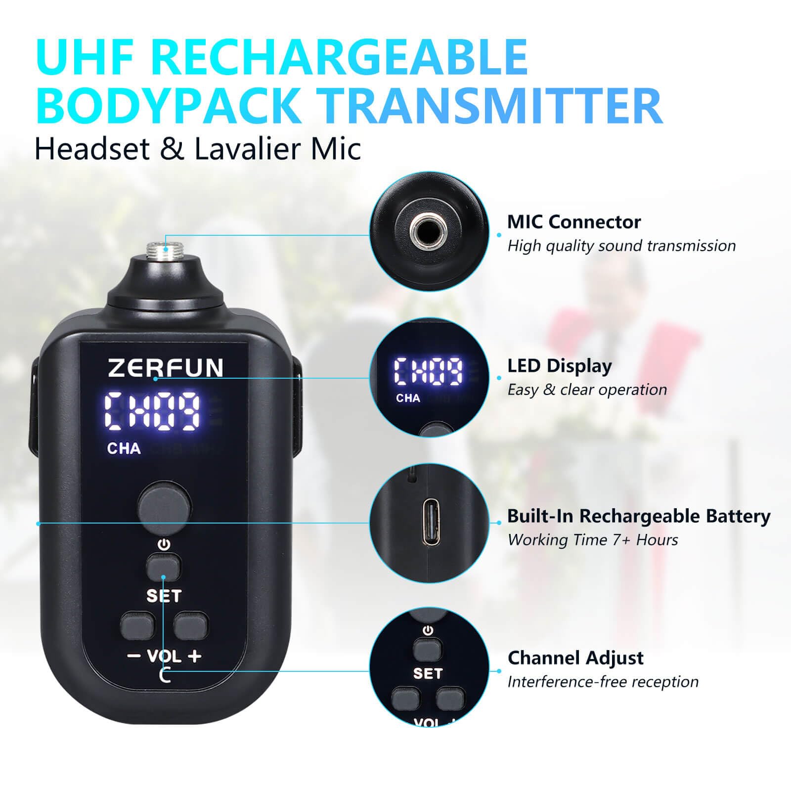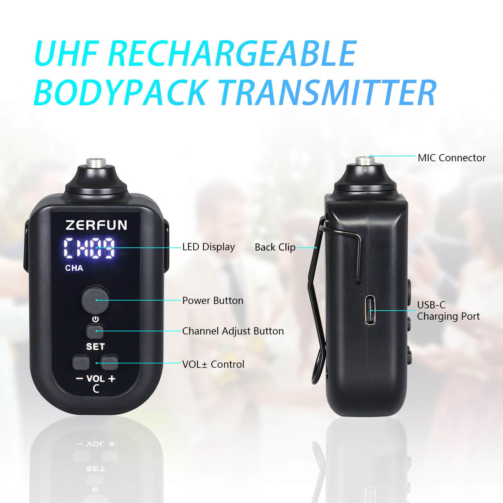 - BATTERY INFO & TRANSMISSION RANGE: Each microphone use built-in rechargeable battery. Microphone Working Time: 10-12 Hours(When full charged). This ZERFUN Wireless Microphone System can support up to 200 feet range, 50 compatible frequencies on each channel(4 X 50) for interference-free reception. The UHF frequencies range within 500 - 599 MHz, are compliant with the FCC regulations.