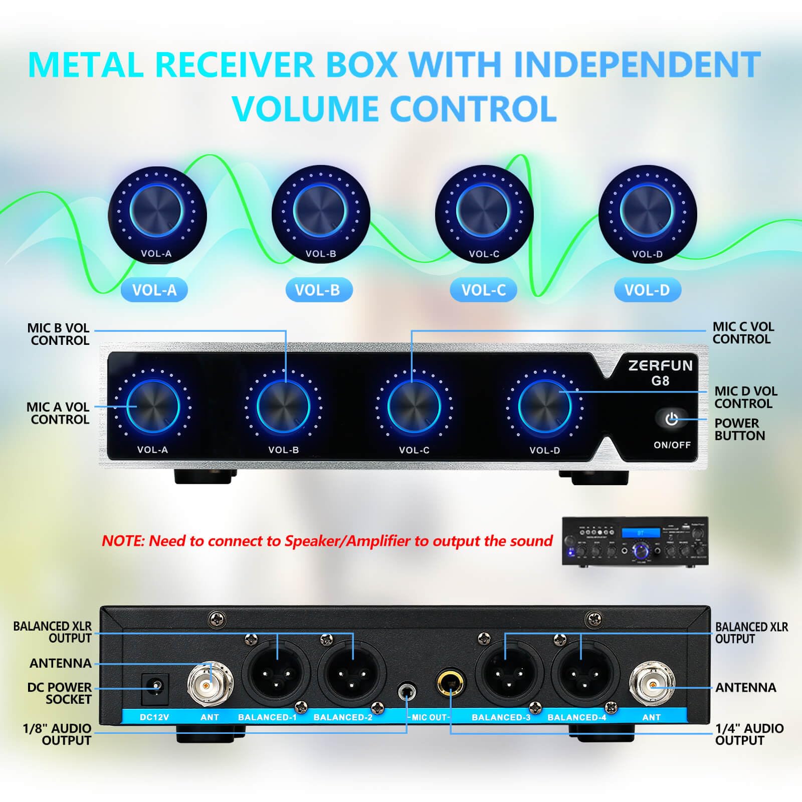 - HIGH QUALITY: ZERFUN G8 Rechargeable Wireless Microphone System offers remarkable value for four microphones. All the handheld mics have a sturdy metal exterior to minimize the impact of scrapes or scratches. When it comes to audio quality, this wireless technology utilizes high-sensitivity unidirectional heads(Only when we speak towards the top of the microphone will there be a sound, while there will be no sound when speaking on the side). With this pickup pattern, the directional vocals are easy to isolate from background noise.