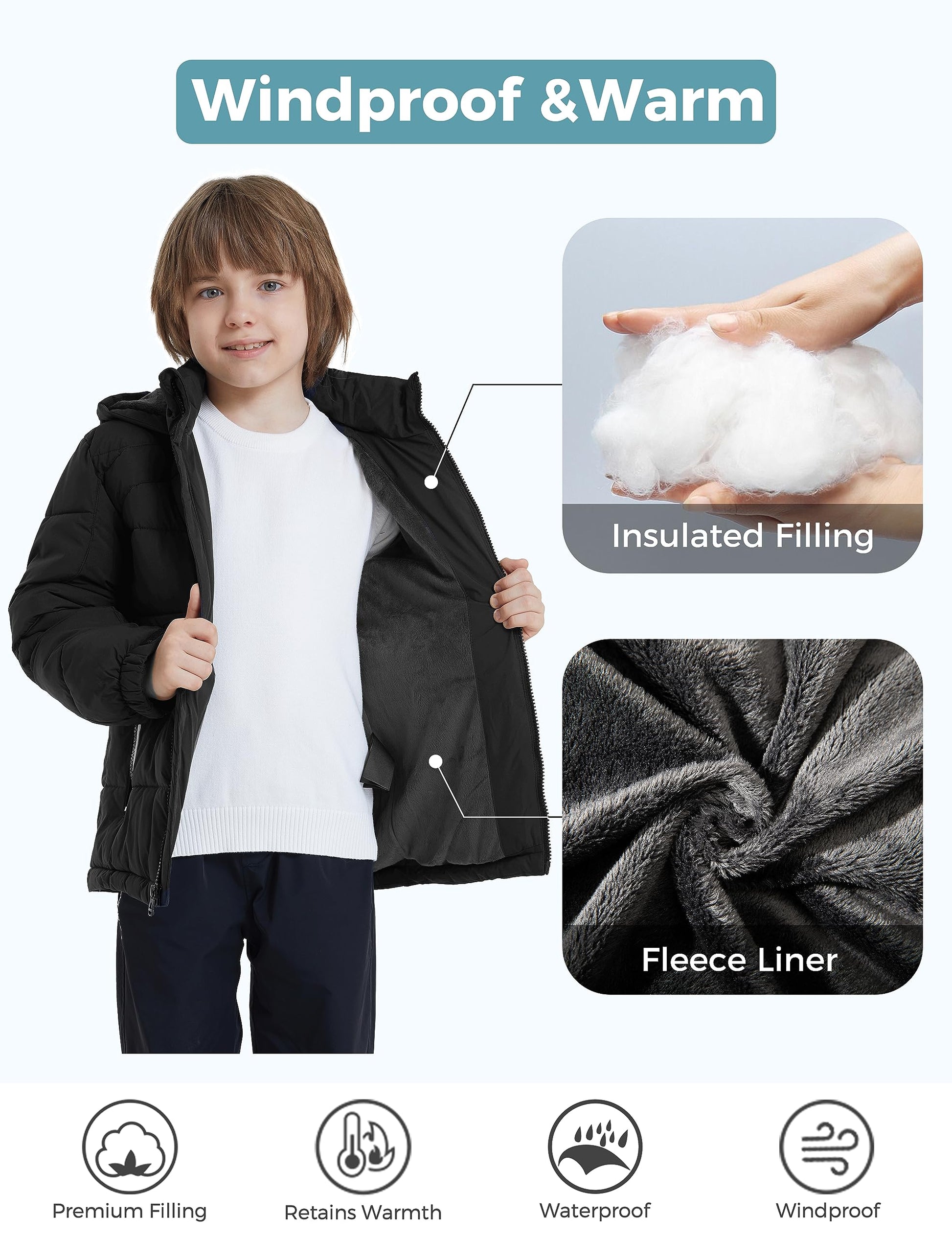 - Windproof Puffer Jackets for Boys - Don’t let the chill ruin your day. Our winter jacket for boys is windproof with its stand collar with storm hood, front zip up and adjustable elastic cuffs, all of which lock in heat and keep off cold air from penetrating. This boy's winter jacket helps child stay warm and comfortable in cold winter.